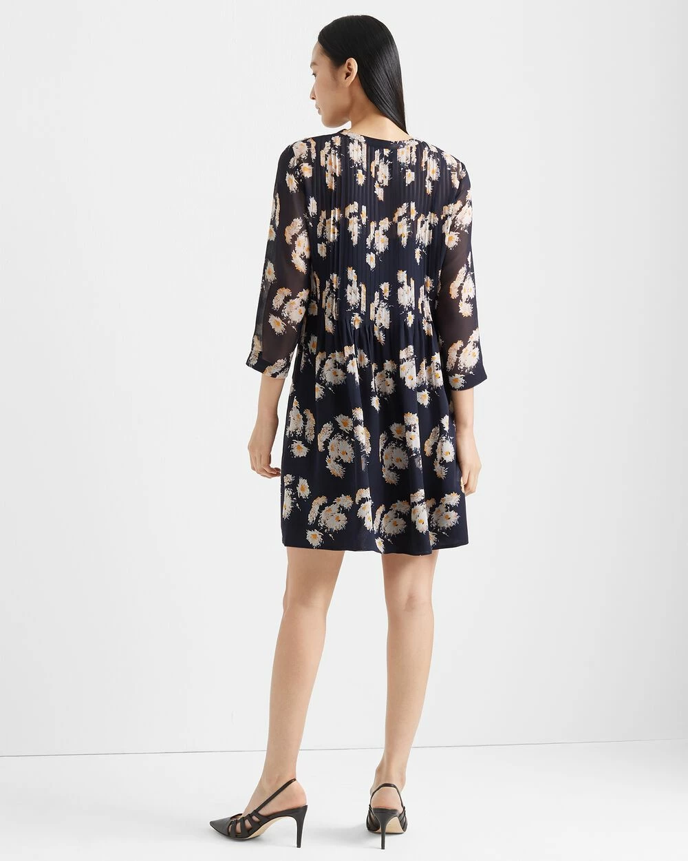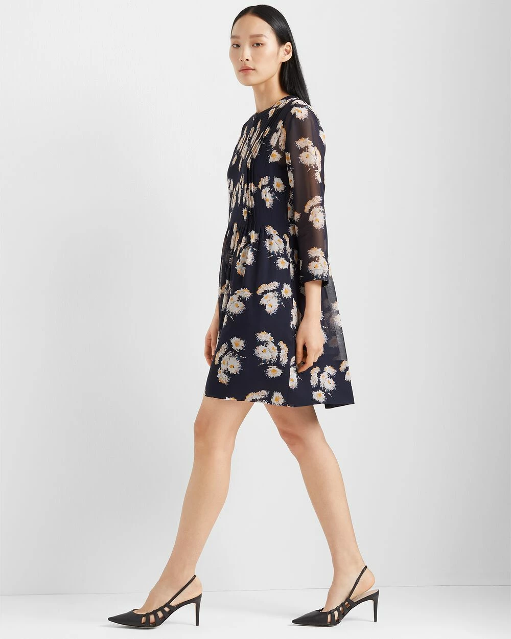 A delicate touch. Fine pintuck pleats shape a layer of printed silk chiffon on a fluid dress.