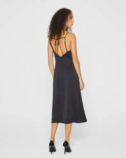 - V-neck; wide shoulder straps; sleeveless; cinched bust; princess seams; natural waistline seam; back center slit