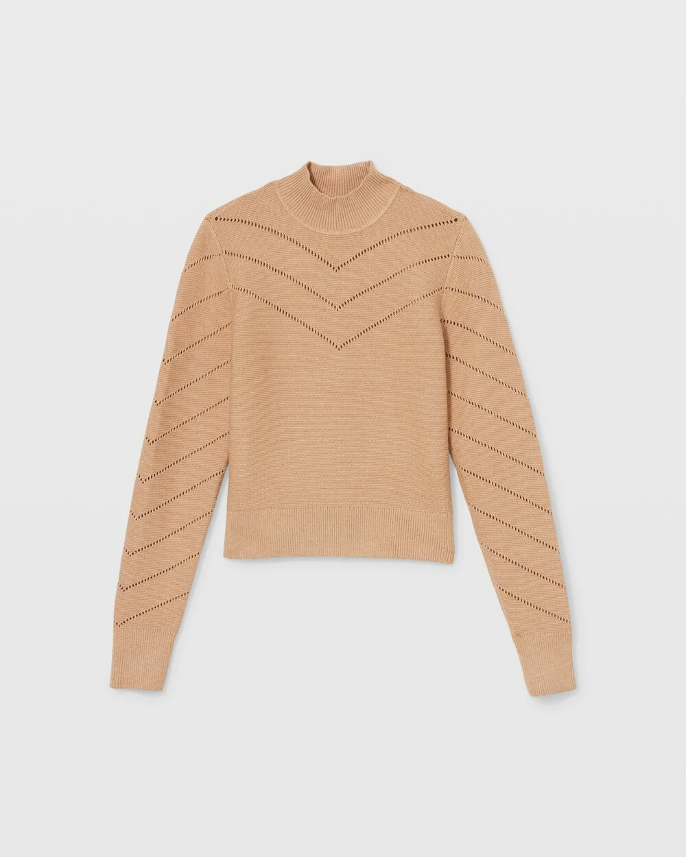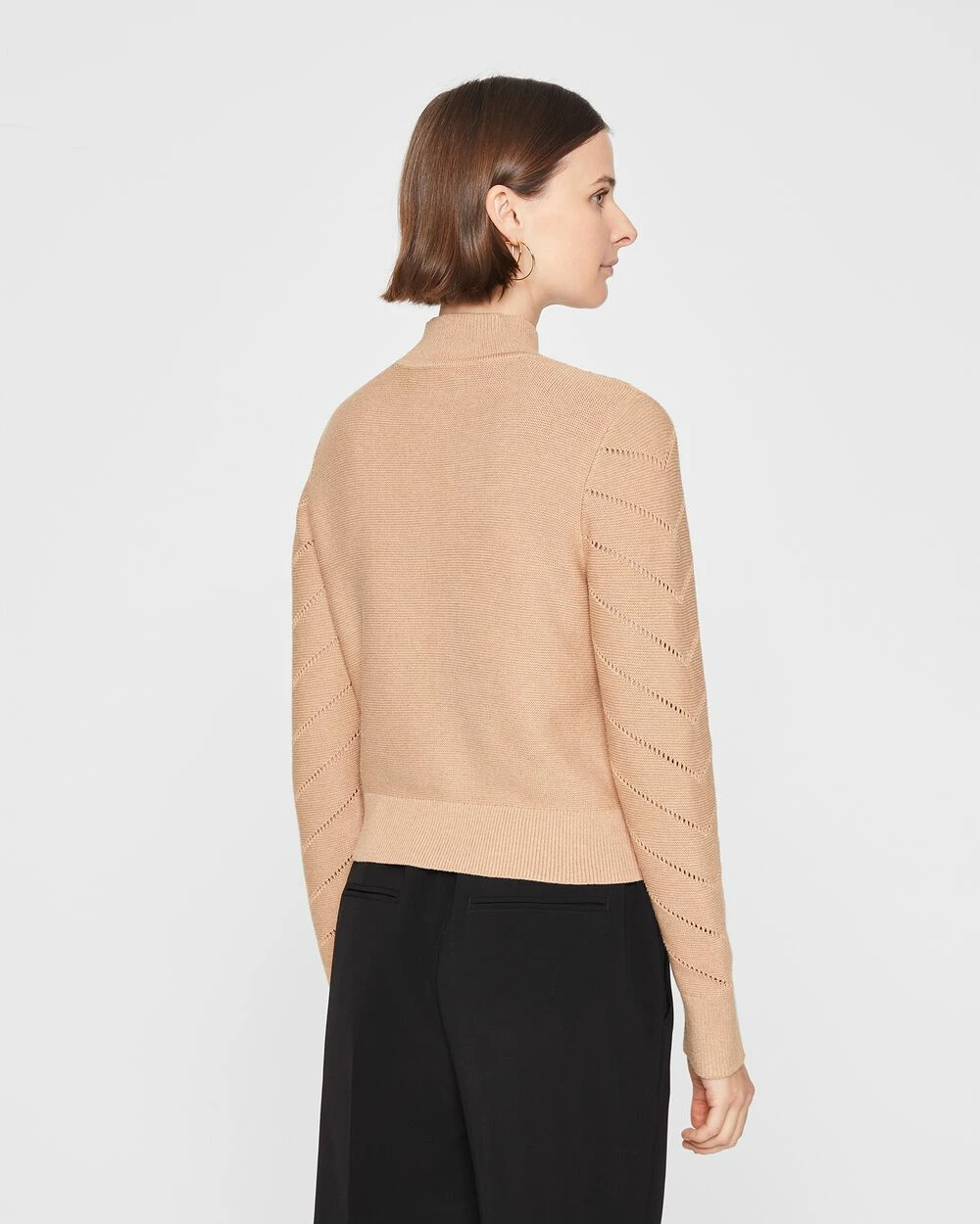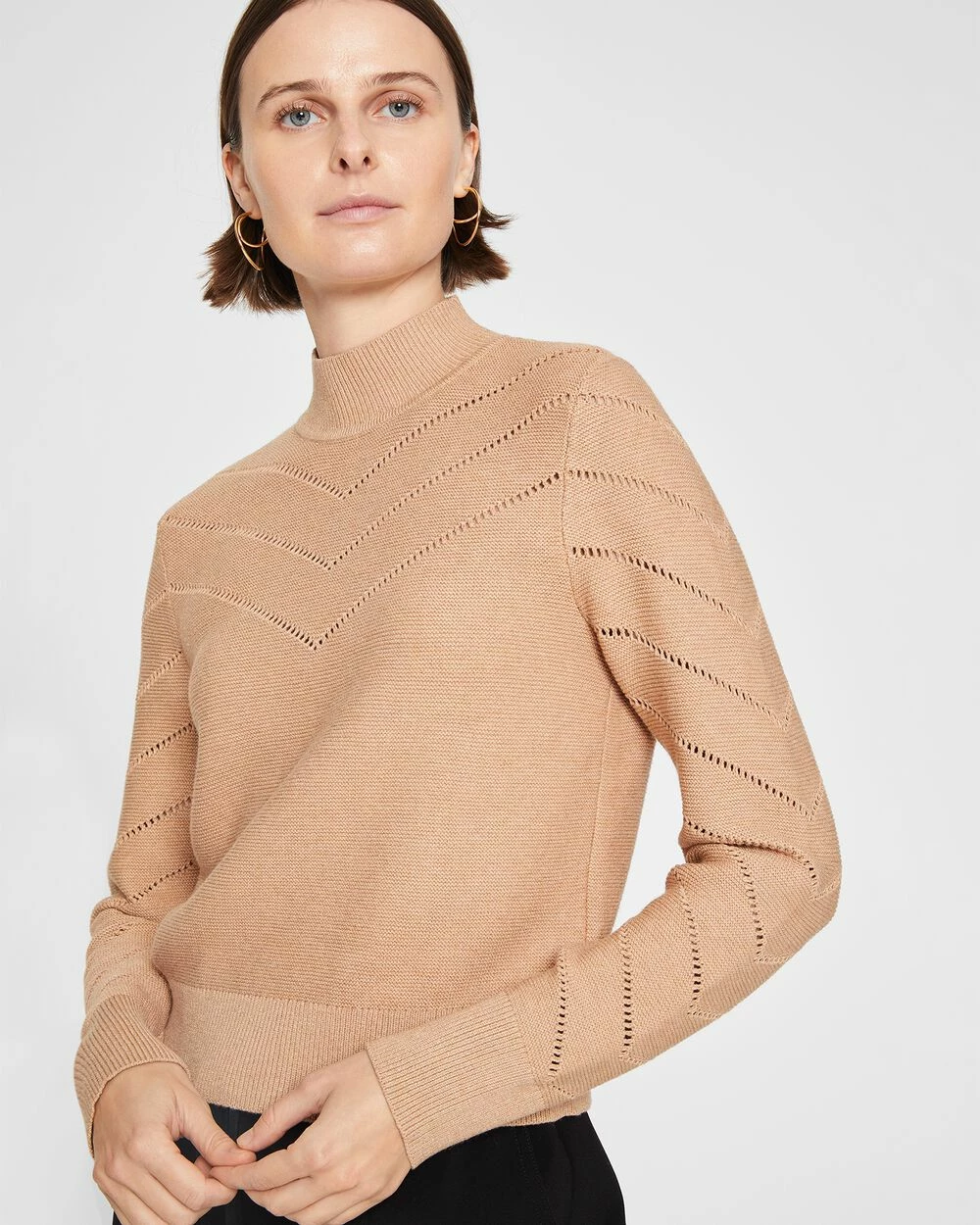 Add some elegance to your wardrobe with this modern mock neck sweater. Designed with pointelle stitches strategically placed for a paneled effect. Wear it solo or style it under structured blazers and classic cardigans.