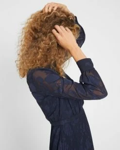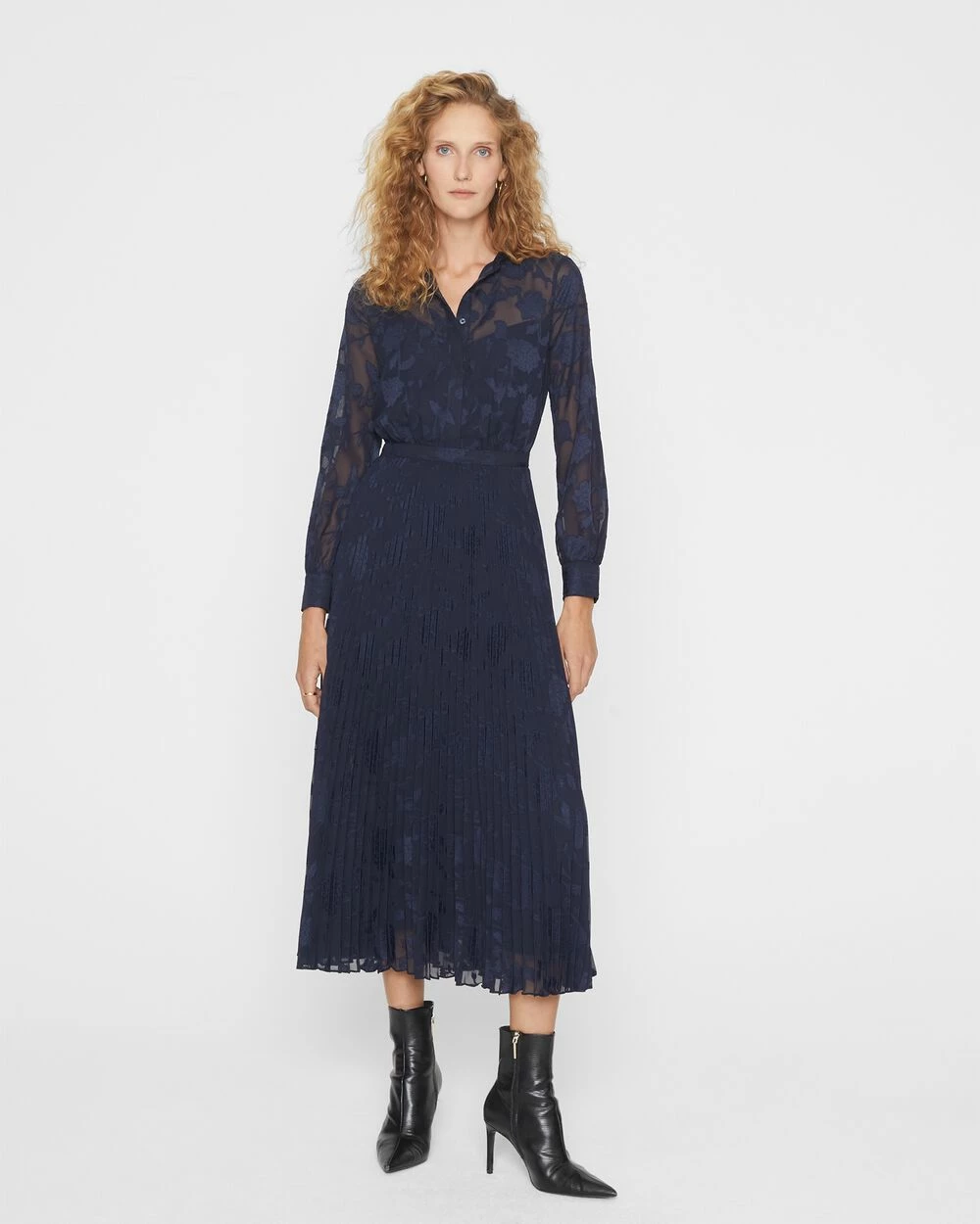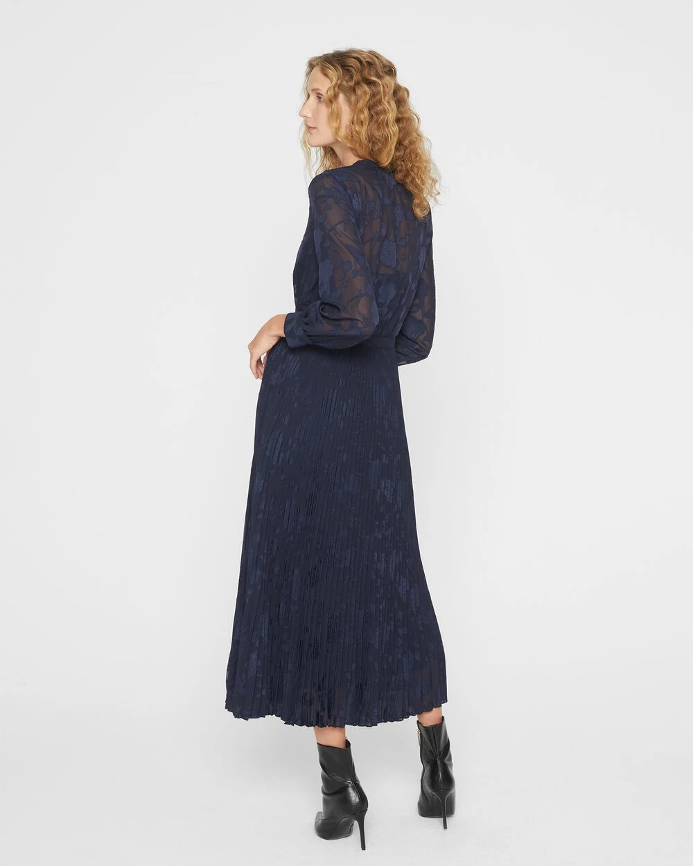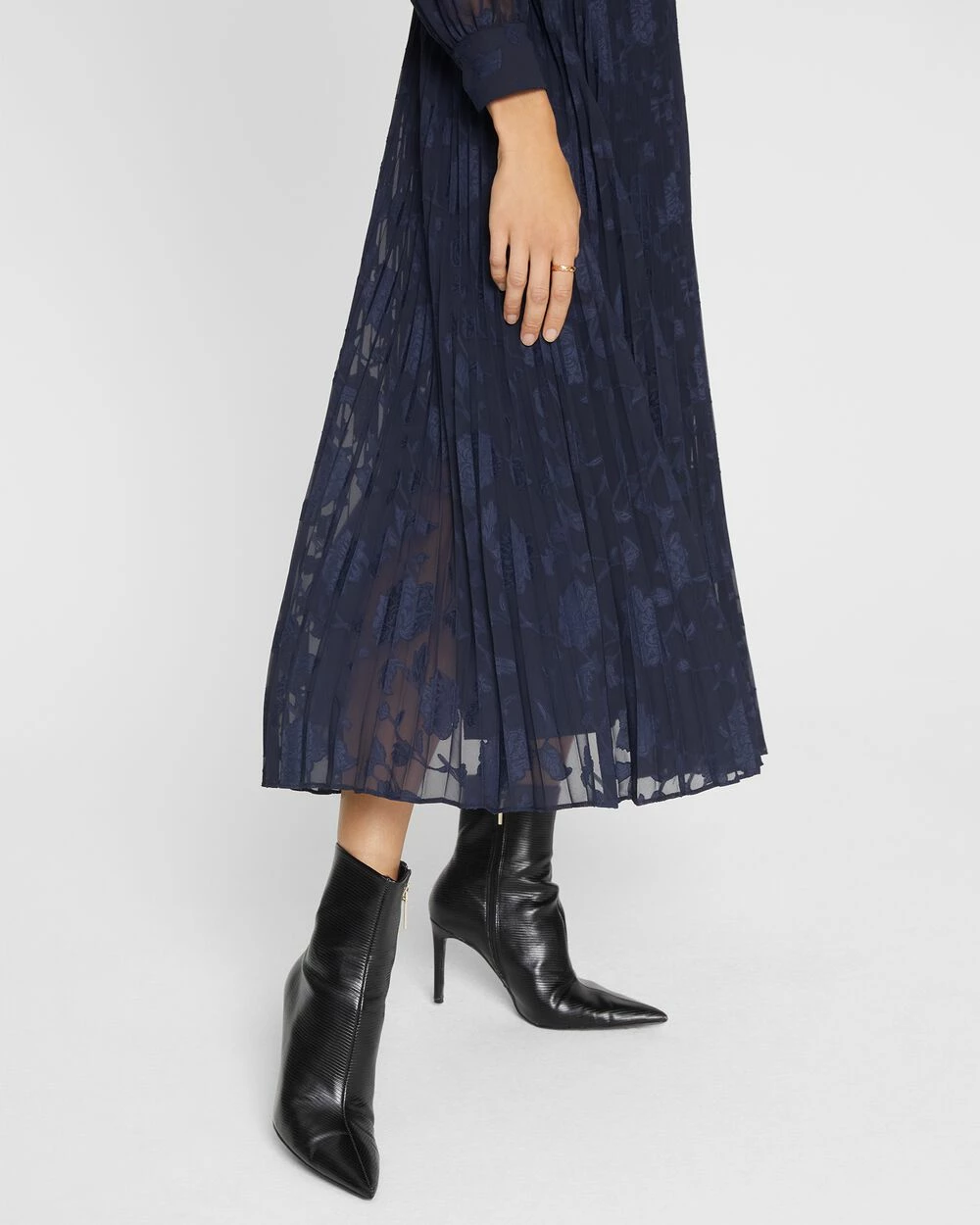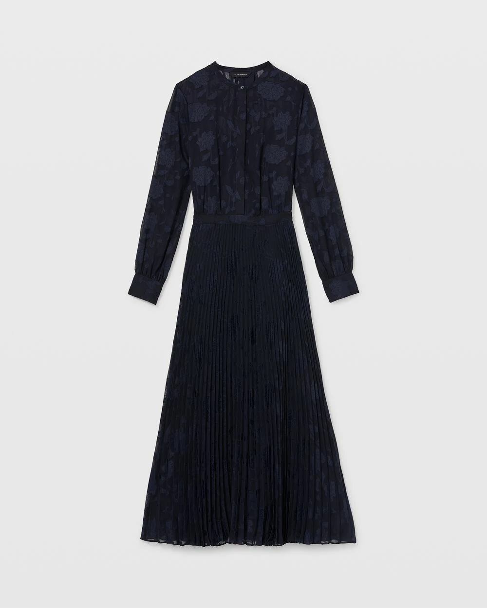 Fine pleats and a floral-jacquard fabric give this polished maxi dress a romantic effect. In the sweet spot between tailored and breezy, this sophisticated A-line silhouette is designed with a jewel neck and long sleeves for cooler days (and nights) ahead.