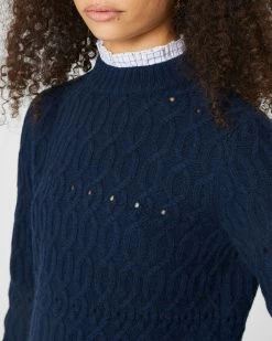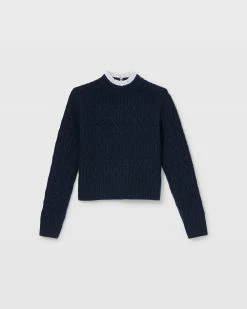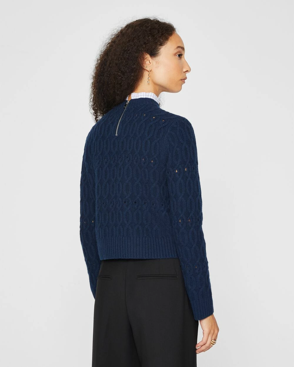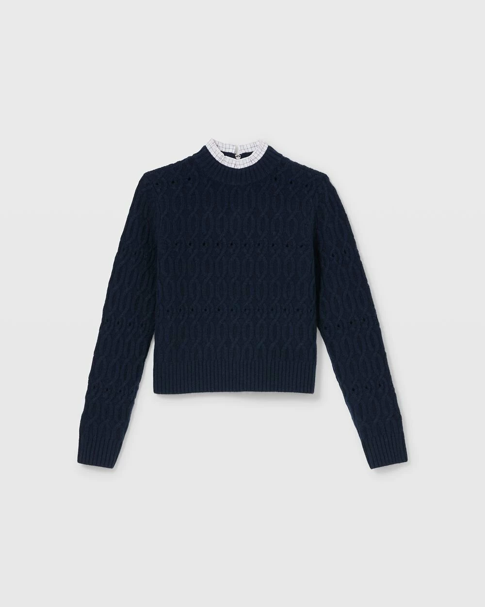 The classic cable-knit sweater cut for a perfect fit and decorated with pointelle stitches throughout. The ribbed jewel neckline with a ruffled trim gives it an even more feminine feel.