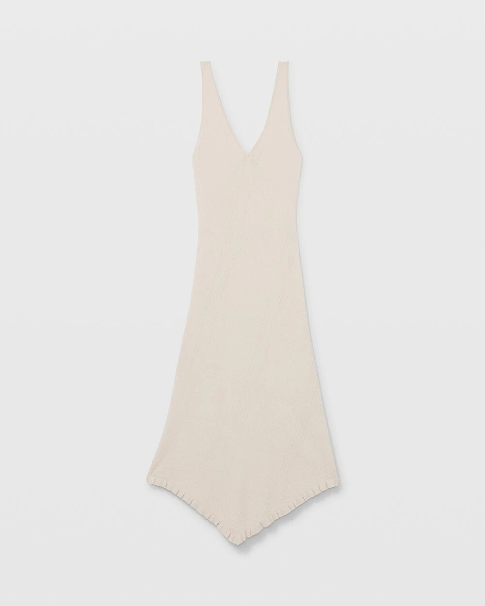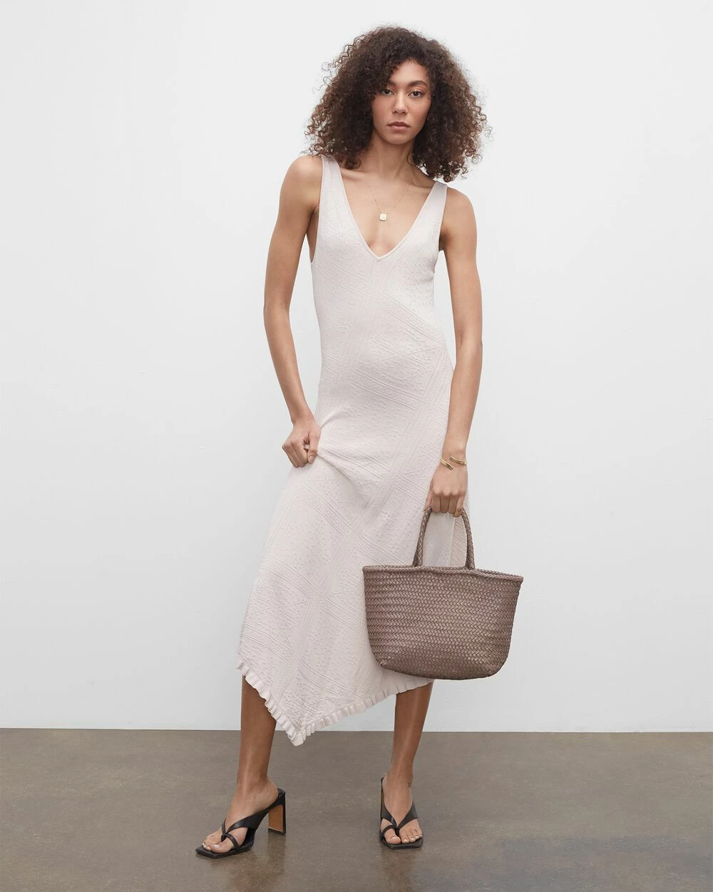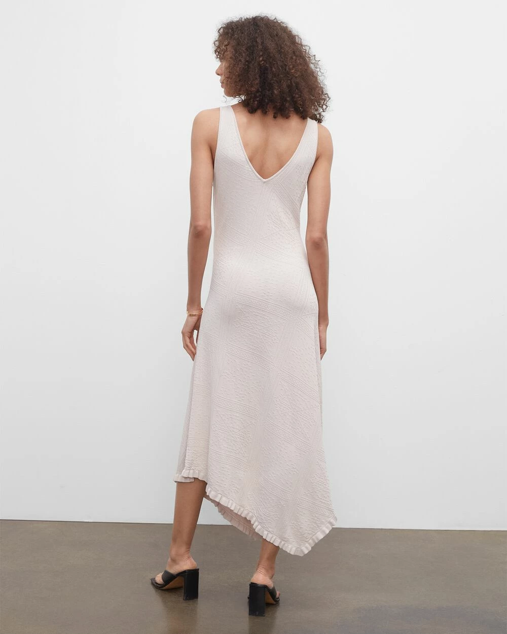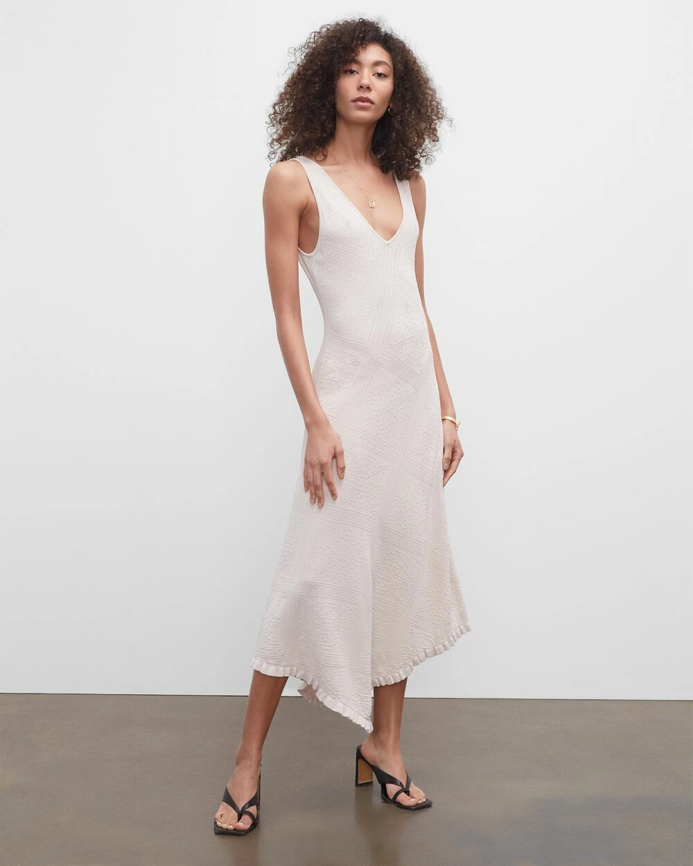 Focal point. All eyes will be on you in this stunning midi dress, intricately detailed with pointelle stitches. Between the sleek silhouette, flattering V-neck, and playful handkerchief hem, can you blame them?