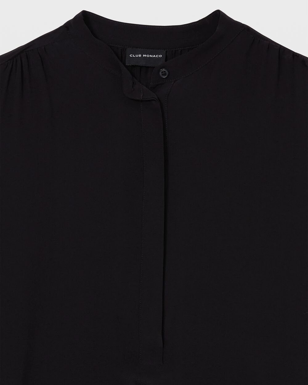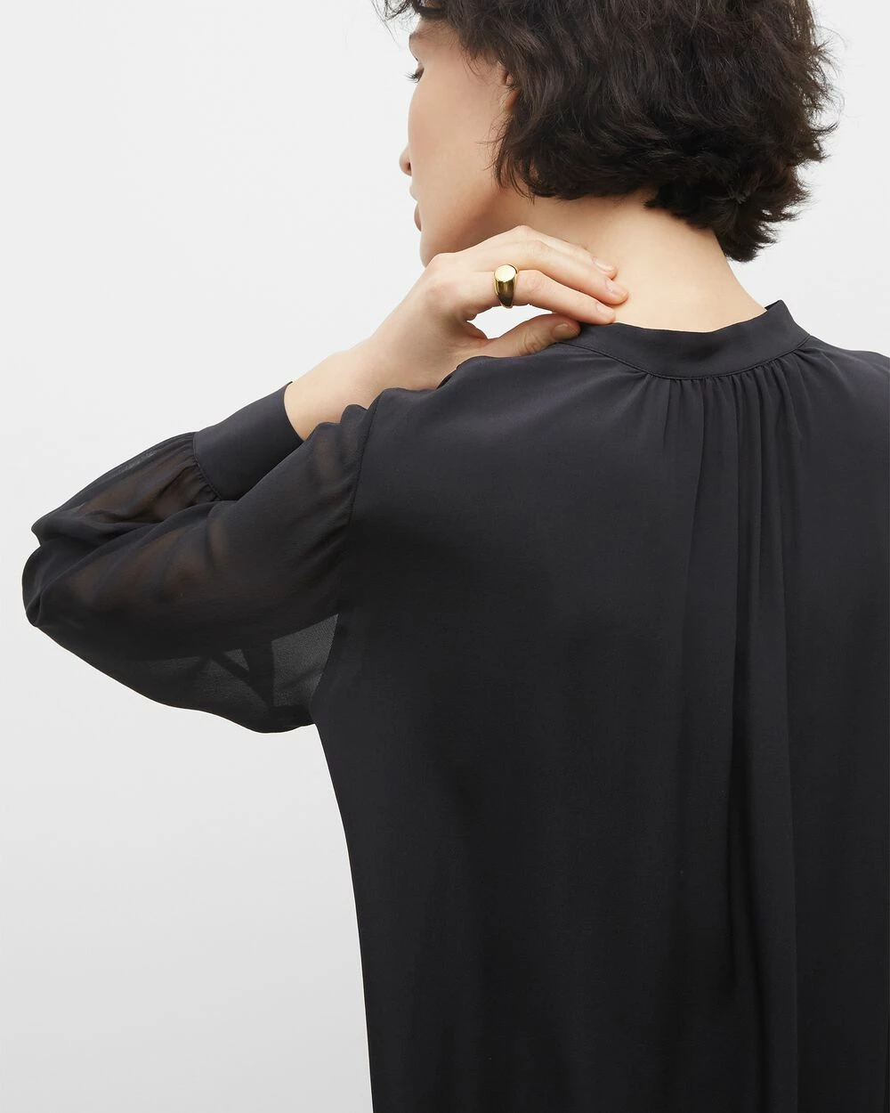 - Band collar; long semi-sheer sleeves; two-button barrel cuffs; center box pleat at back