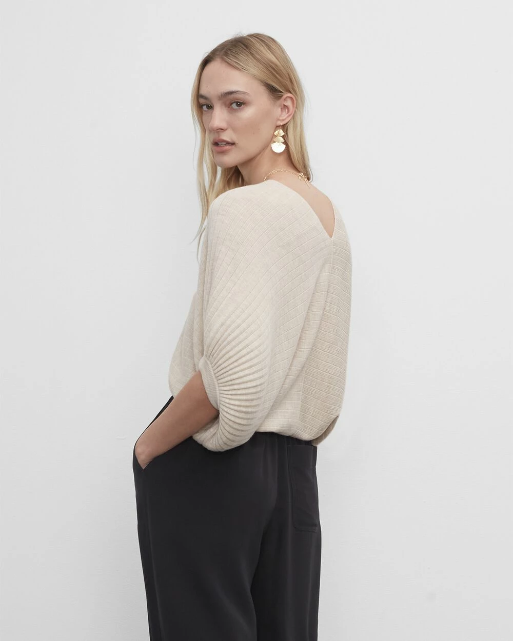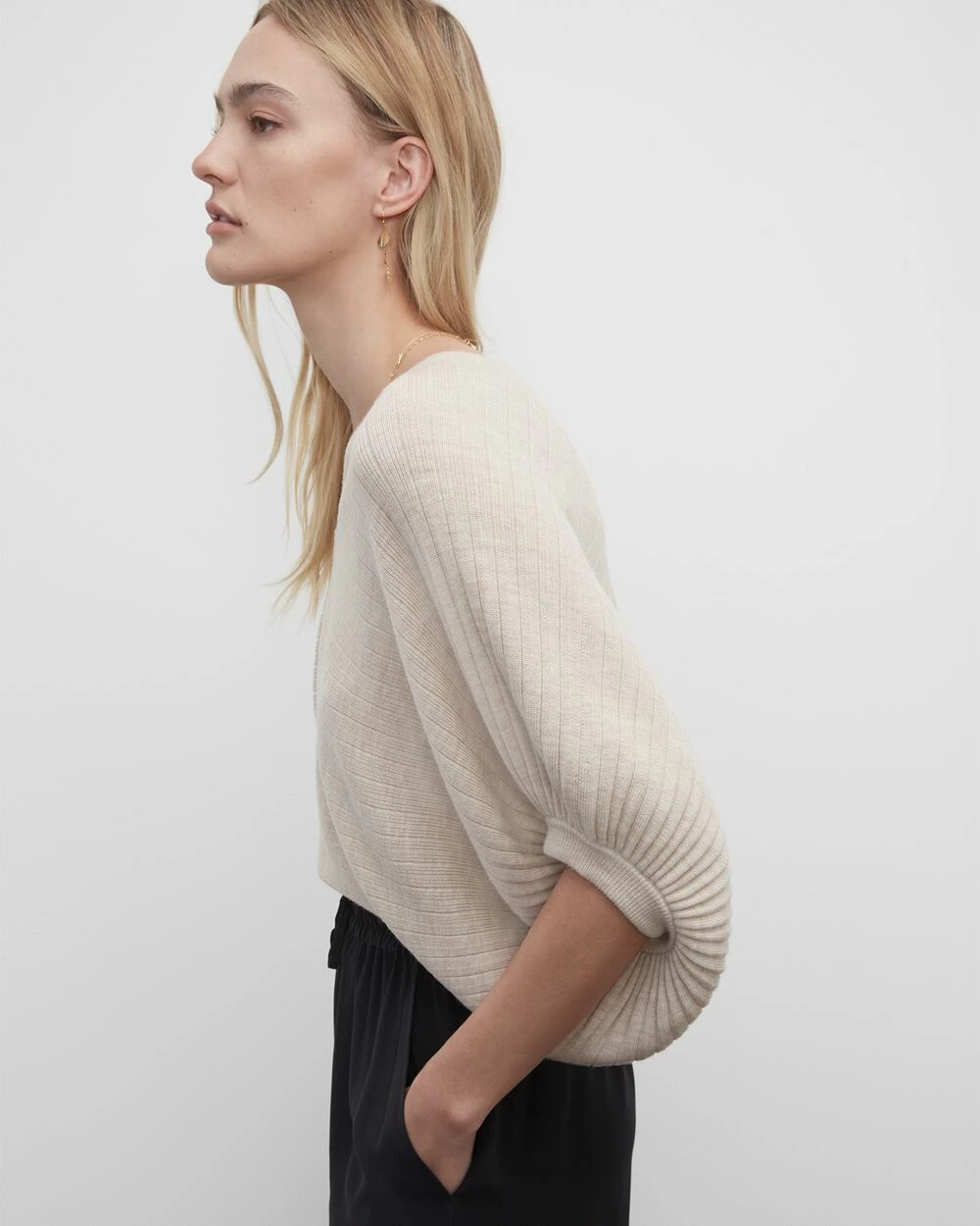 A V-neck sweater speaks volumes, thanks to striking dolman sleeves and a slouchy fit. In an ultra-fine merino wool rib-knit.