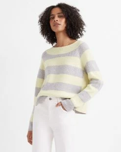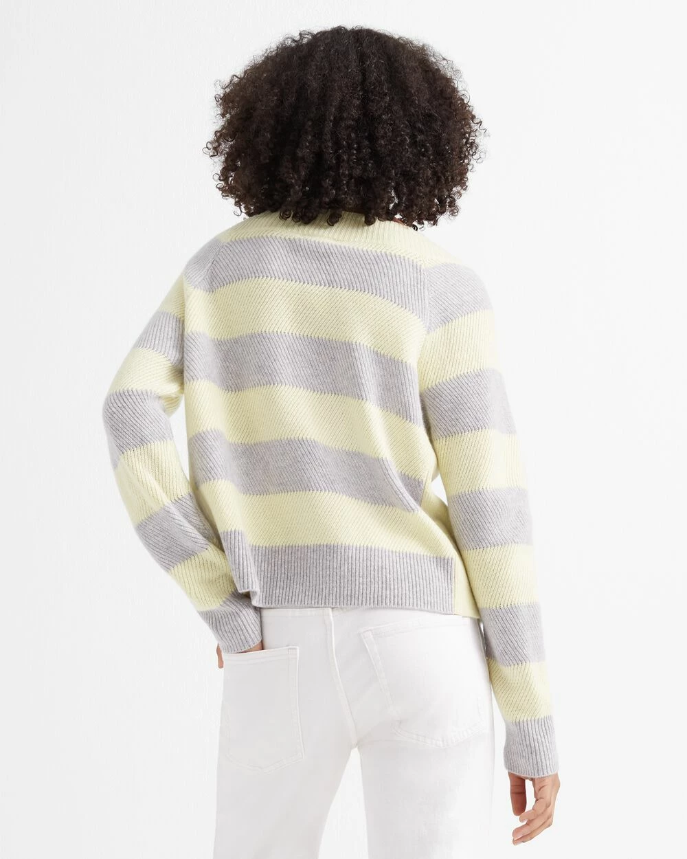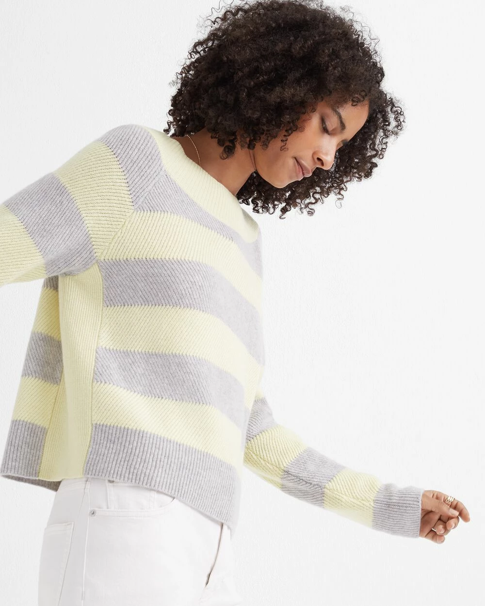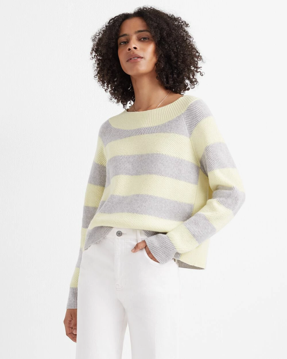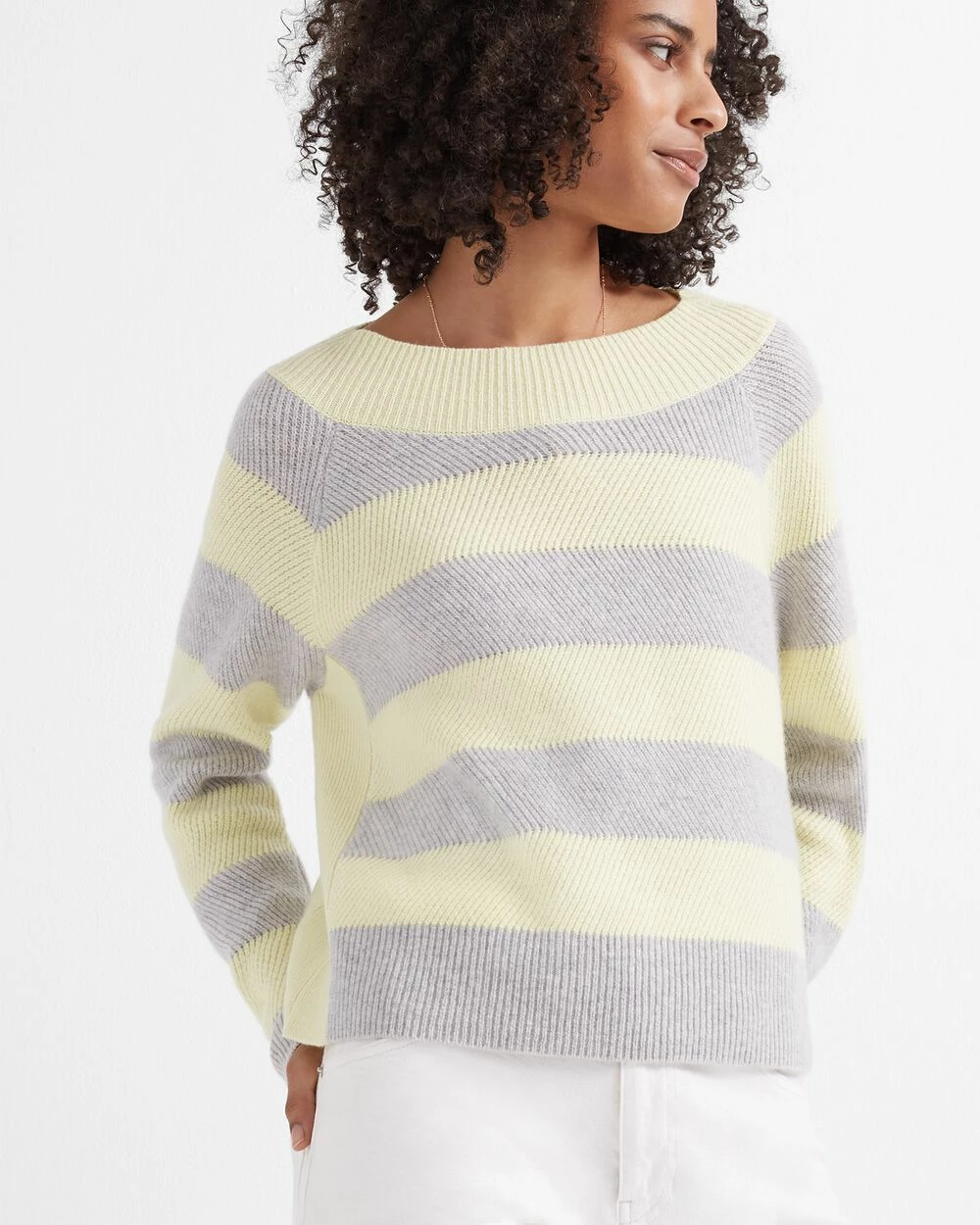 Feeling crafty. A slouchy sweater gets an artistic look via a racked stitch knit. In 100% cashmere.