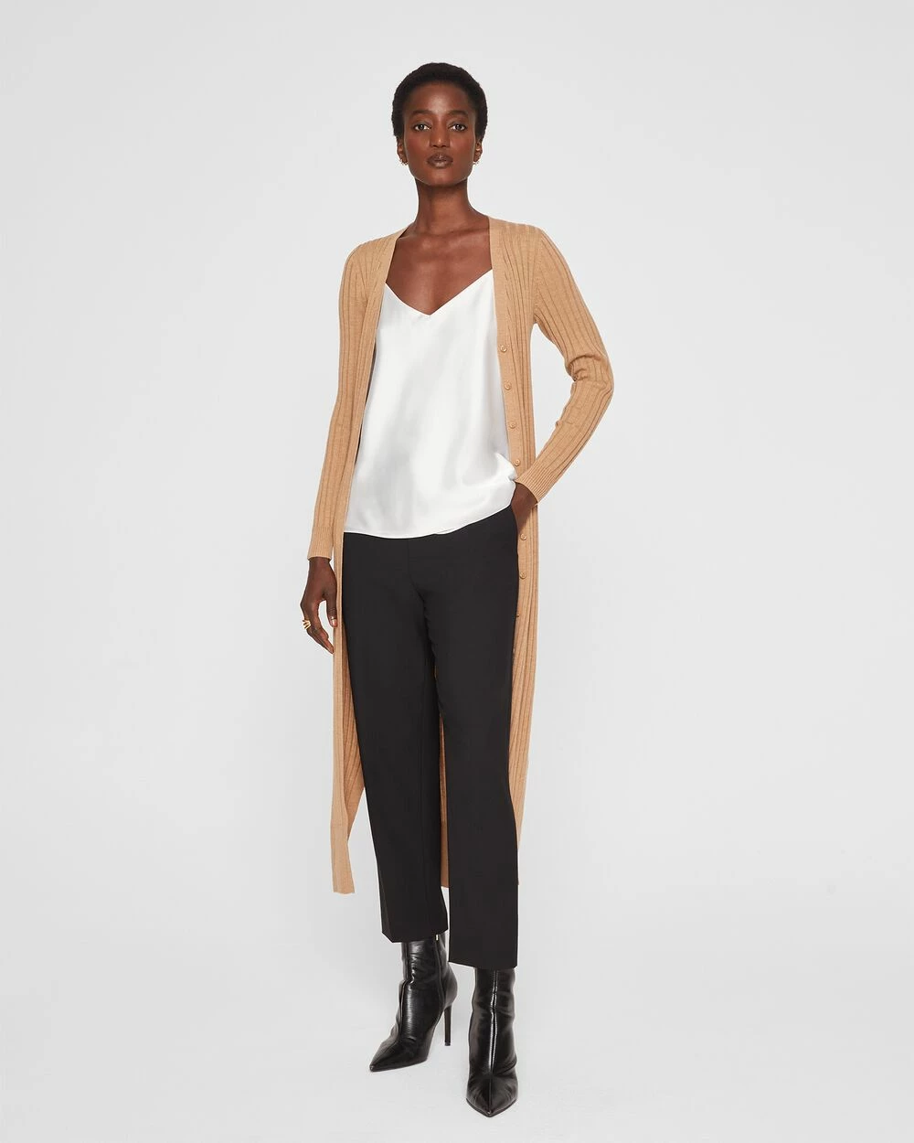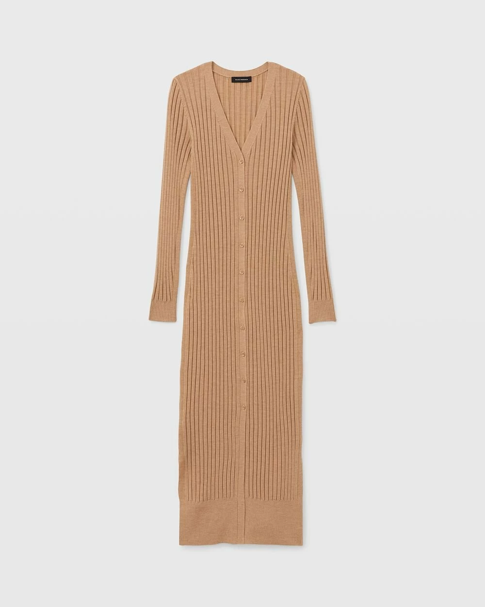 Team favorite. Versatility is what we love most about this sleek style, which transitions from a long-sleeve cardigan dress to a full-length traditional cardigan. An easy day-to-night option made from soft, fine wool with ribbing for that contoured comfort we just can’t get enough of.