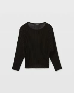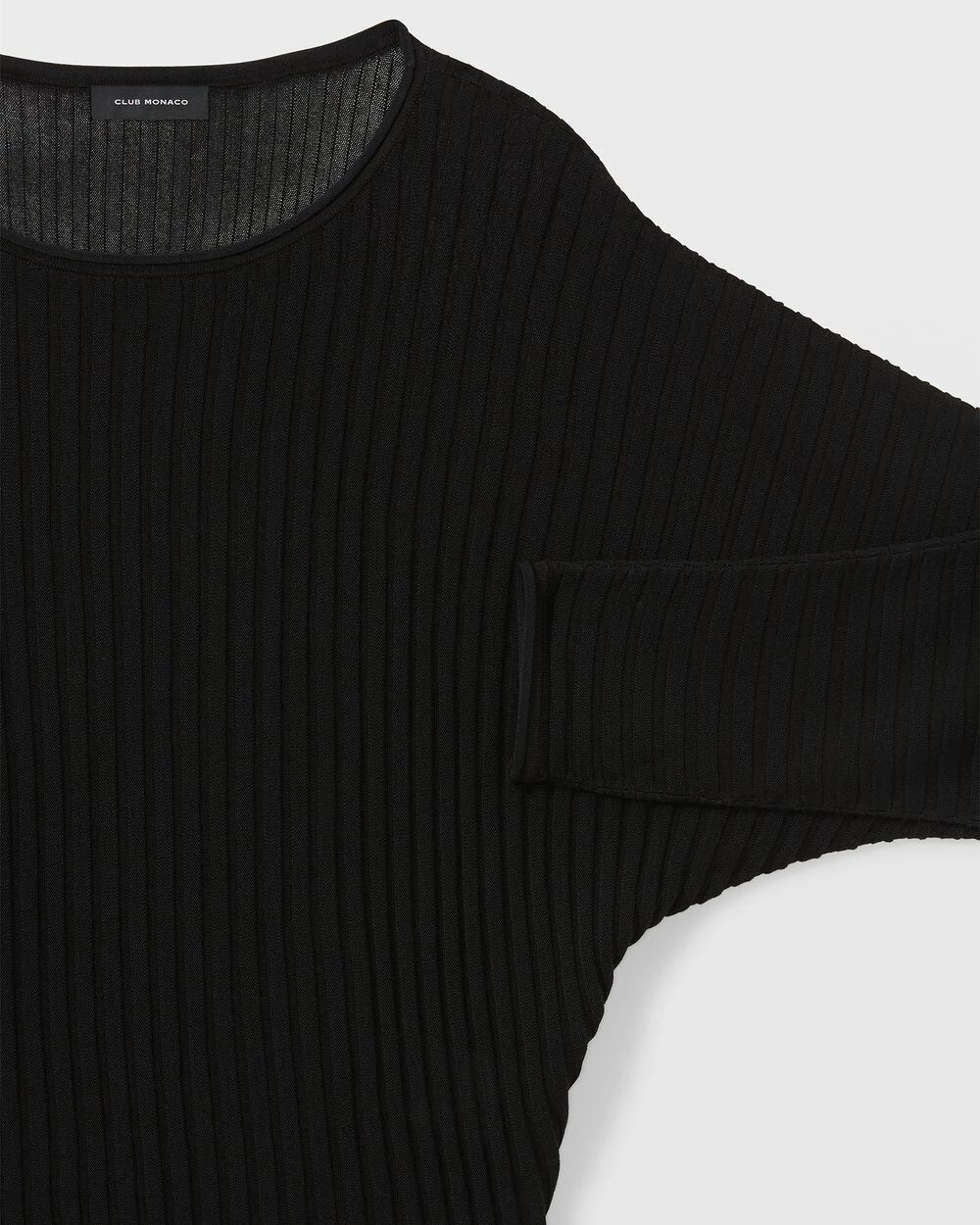 - Rolled-edge crewneck and cuffs; long dolman sleeves; allover ribbing
