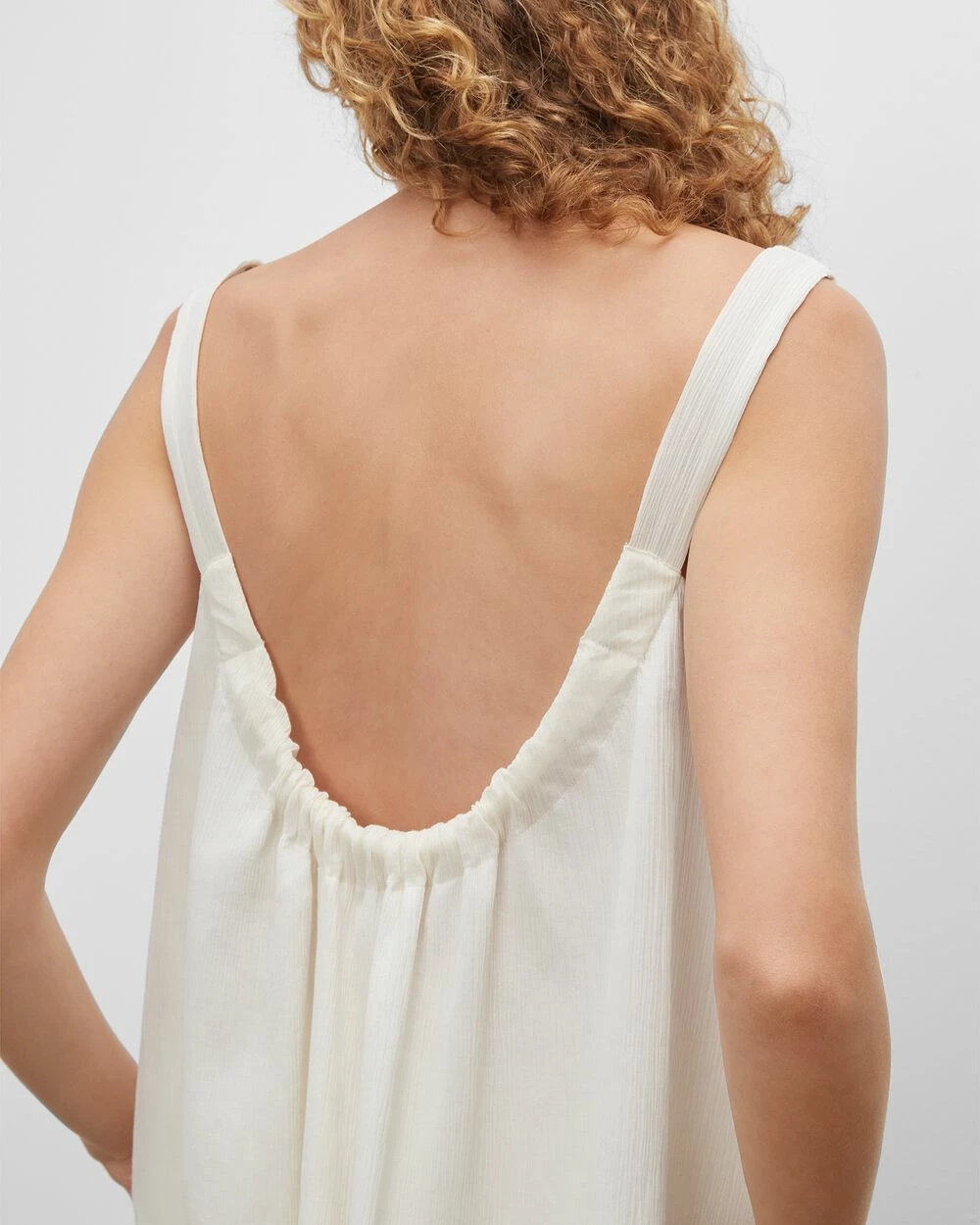 - Square neck; sleeveless; low ruched back; shirttail hem