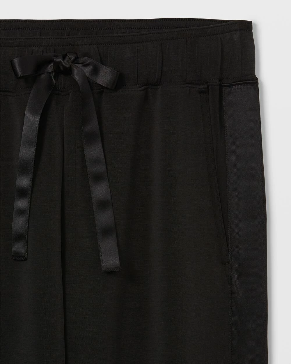 - Cased elastic waistband with satin drawstring; two side pockets; satin tuxedo stripes