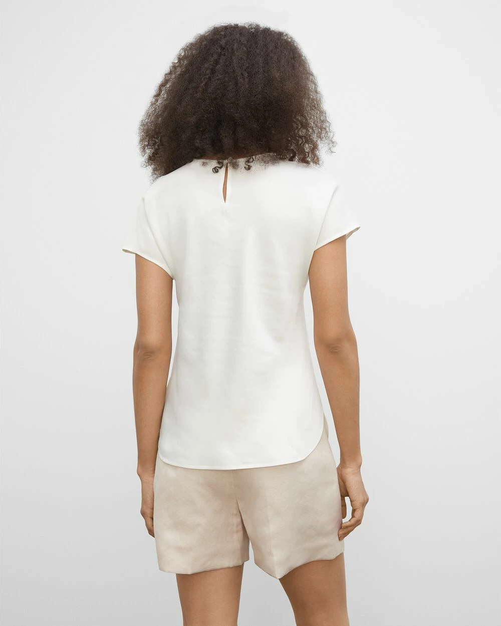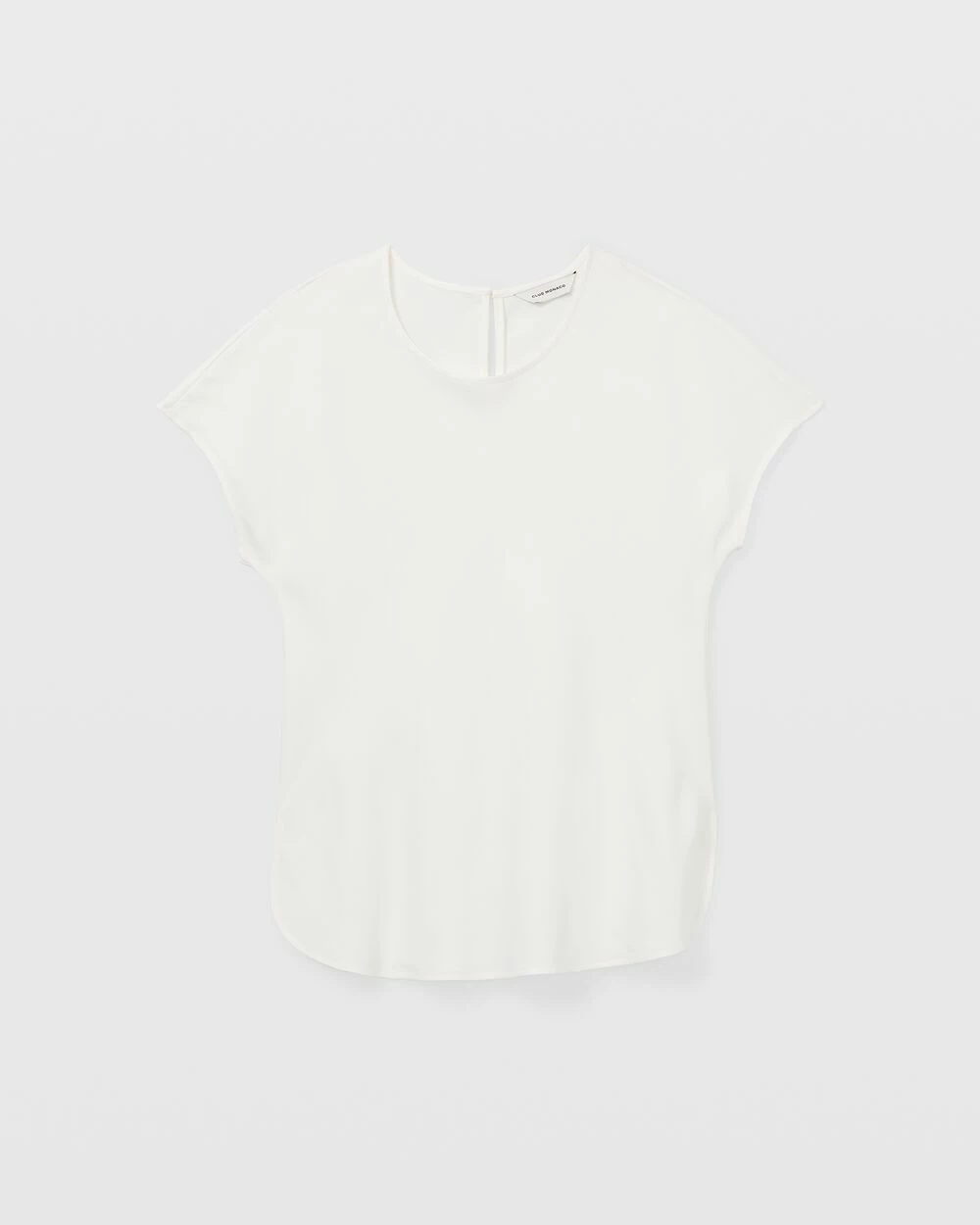 - Round neck; cap sleeves; curved hem