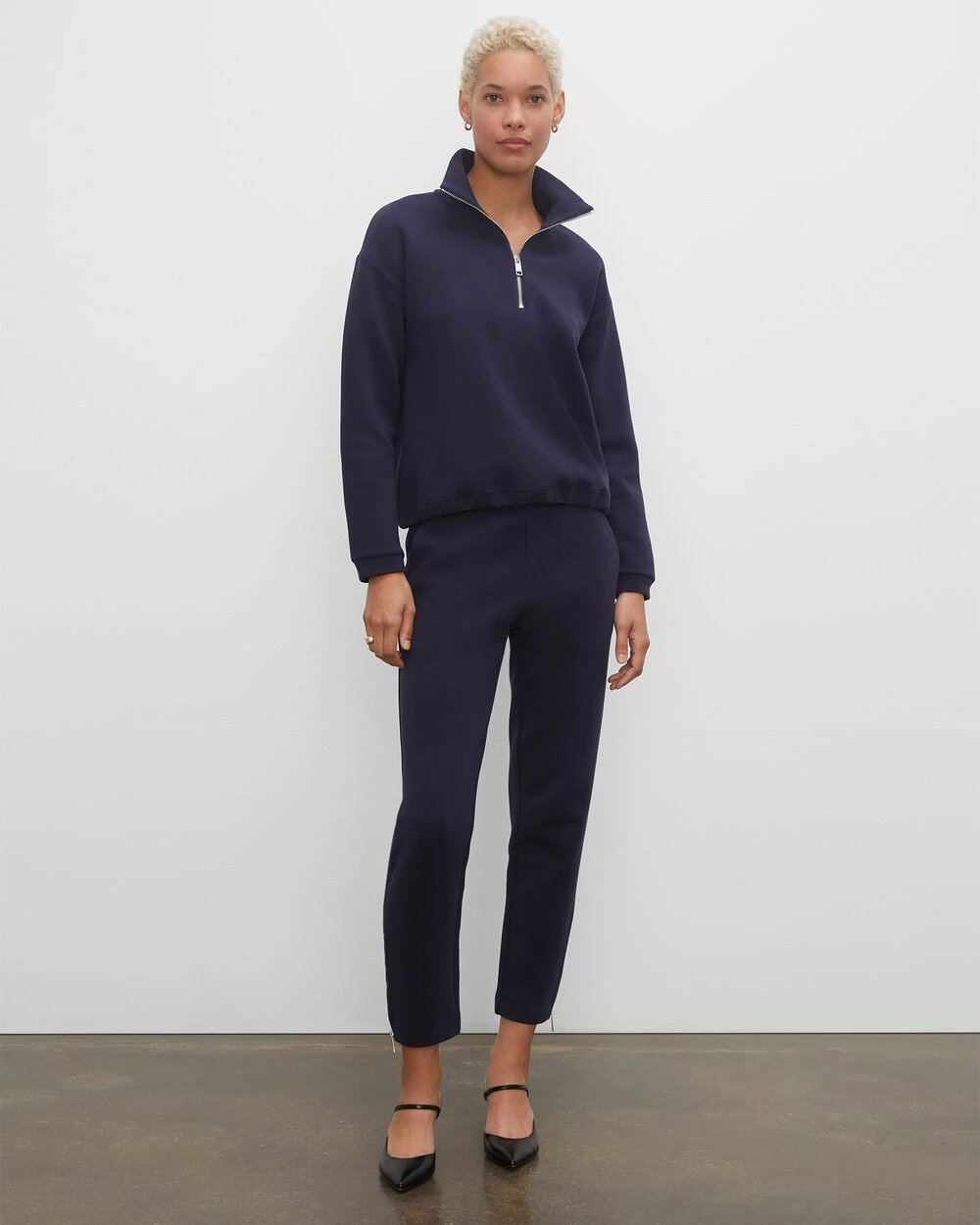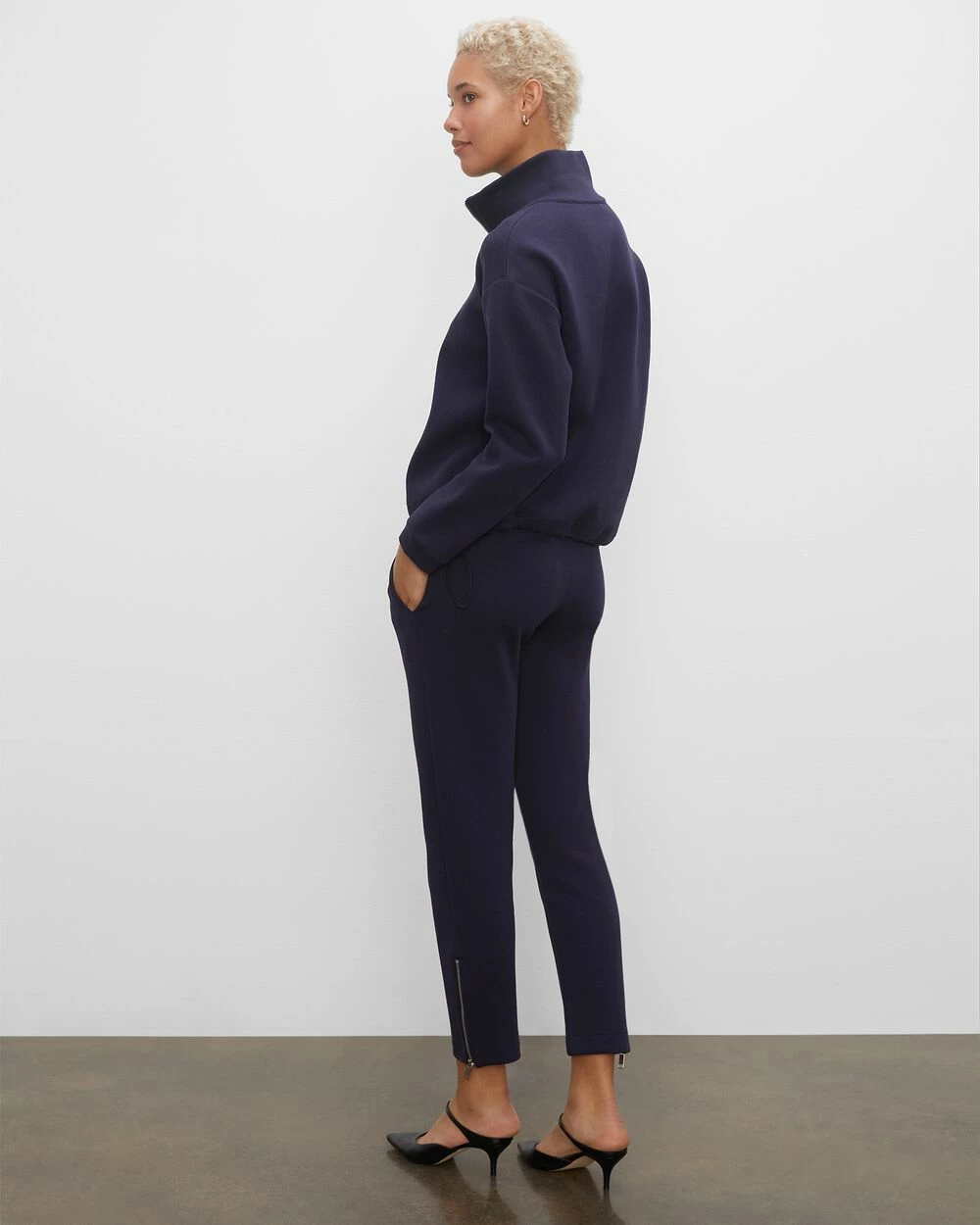 Sleek meets sporty. Zip cuffs and a smooth neoprene fabric take a pair of sweatpants from standard to sophisticated. Pair it with the matching sweatshirt for a monochromatic moment.