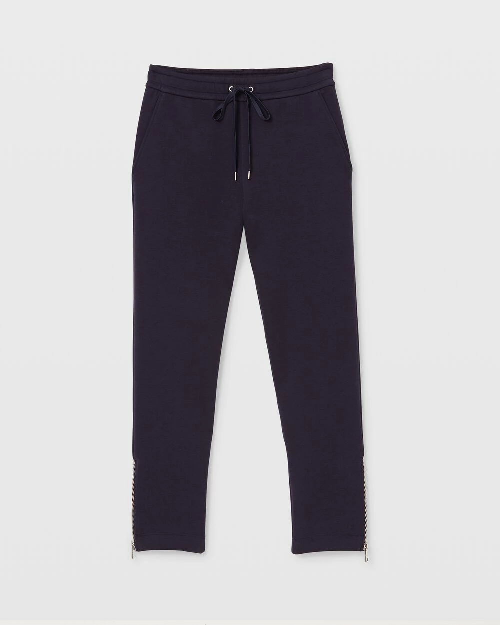 - Cased elastic drawstring waistband; two side pockets; two back pockets; zip cuffs