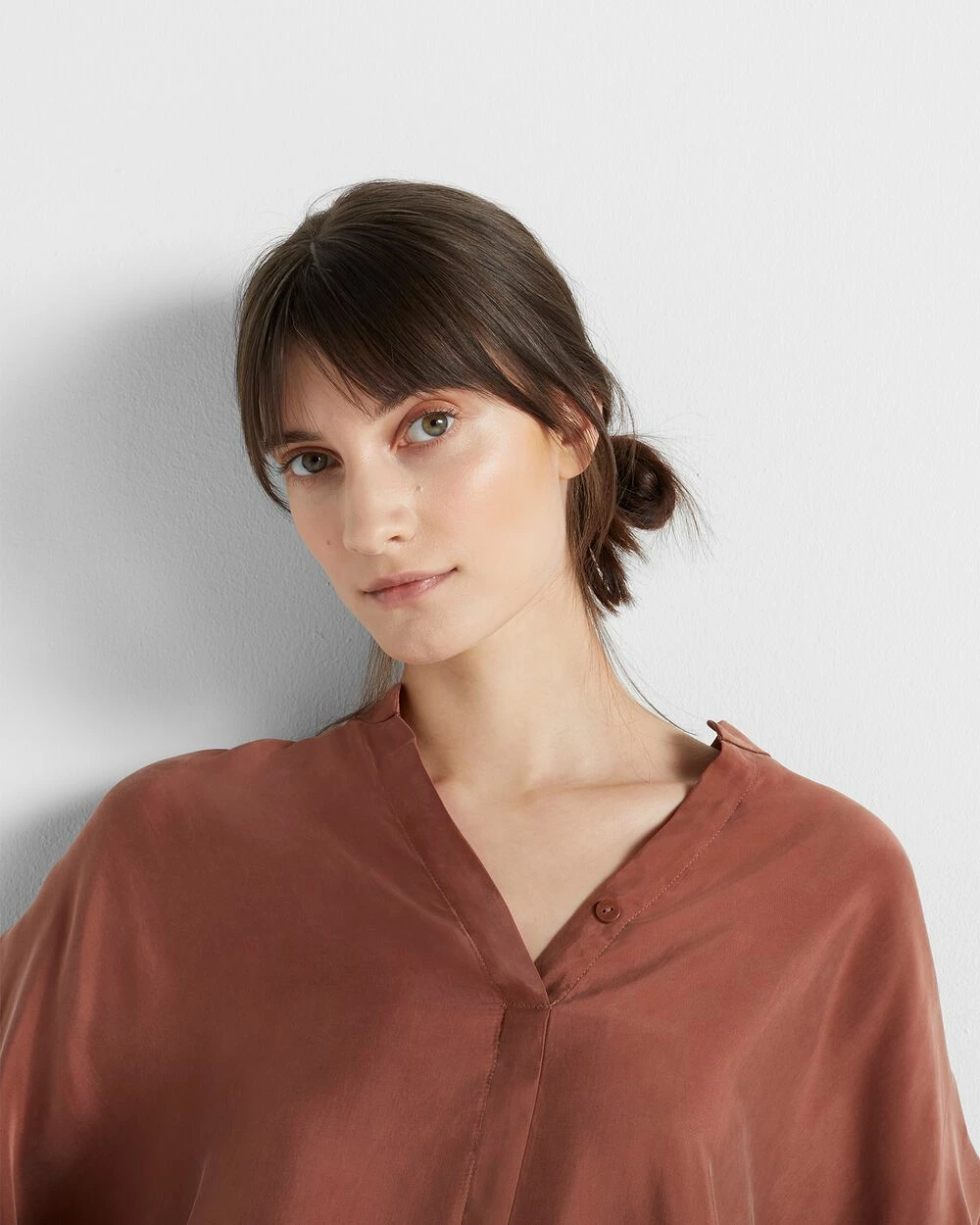 - Split band collar; concealed quarter placket with button closures; drop shoulder; high-low shirttail hem; covered buttons at cuffs