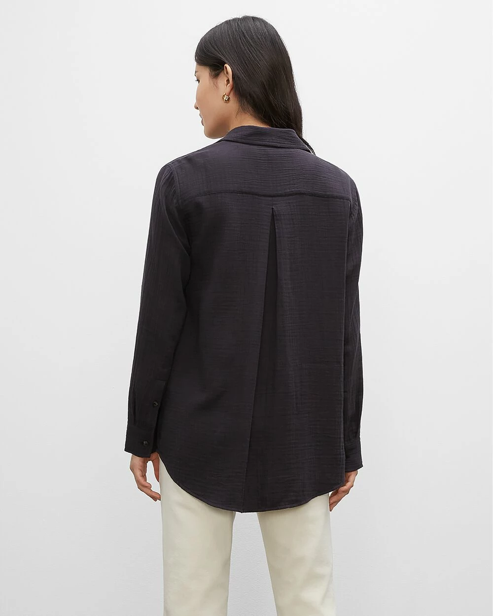 - Spread collar; two chest pockets; long sleeves; single-button barrel cuffs; shoulder yoke and inverted pleat at back; shirttail hem with side-seam slits