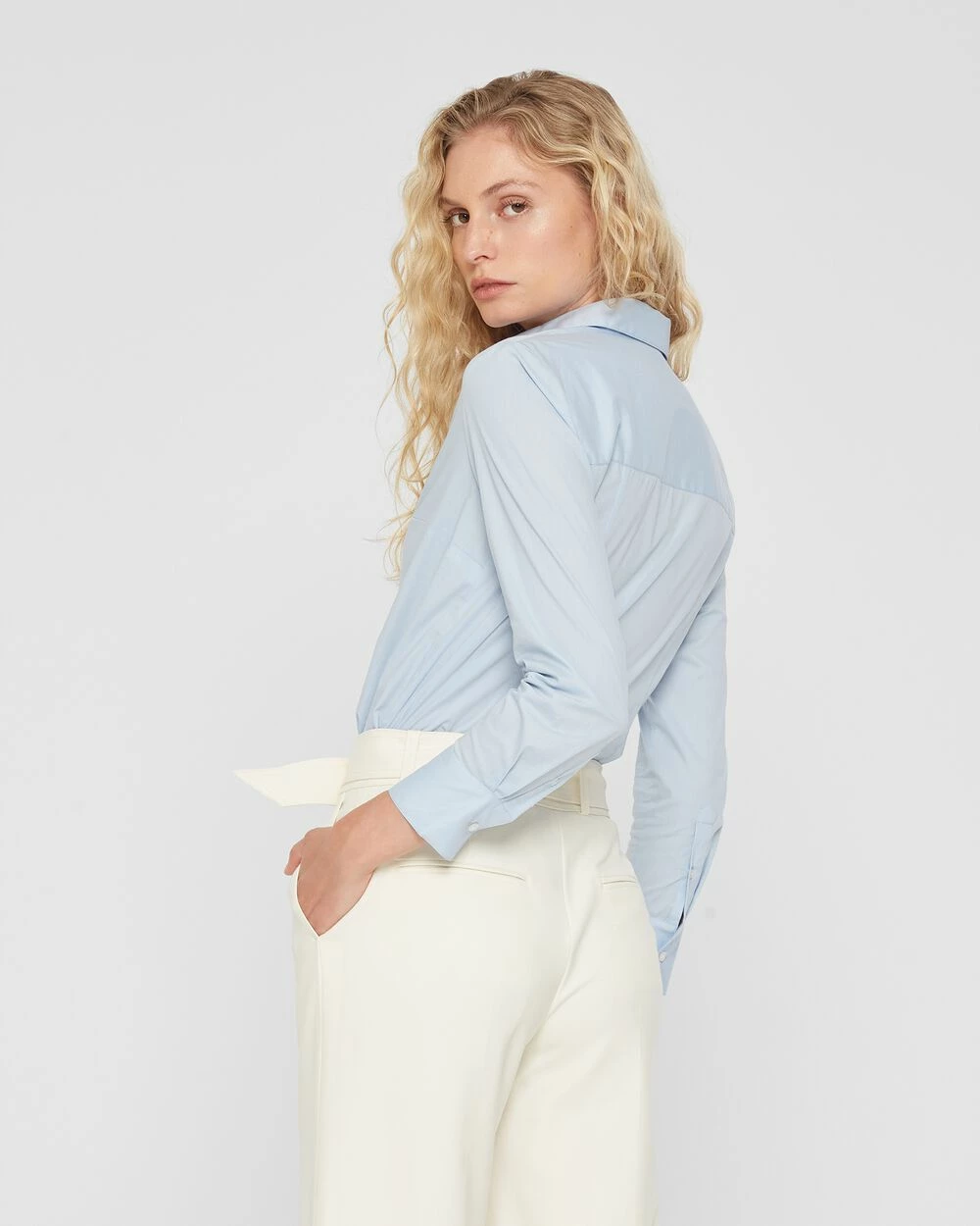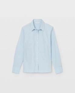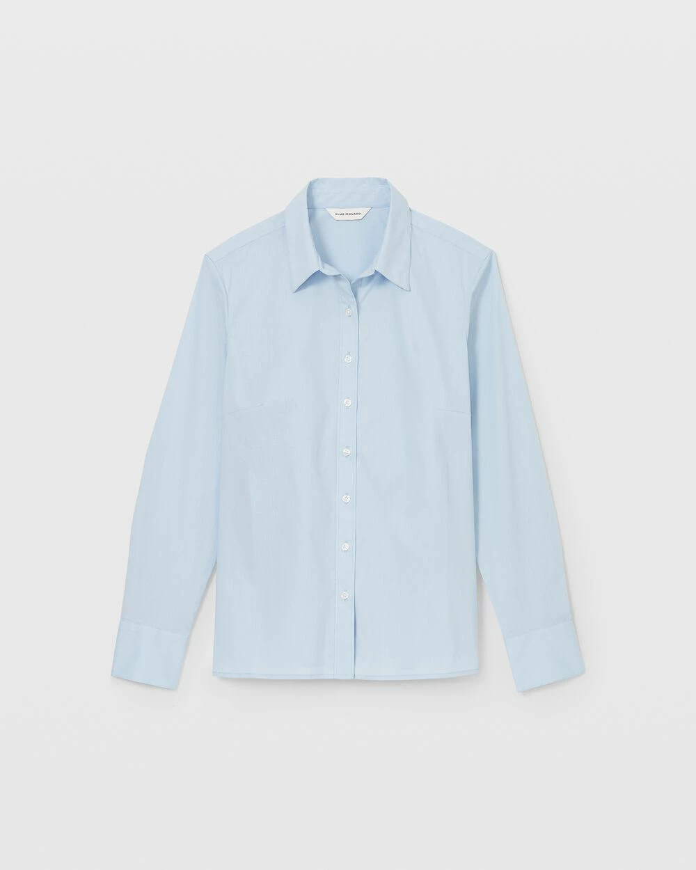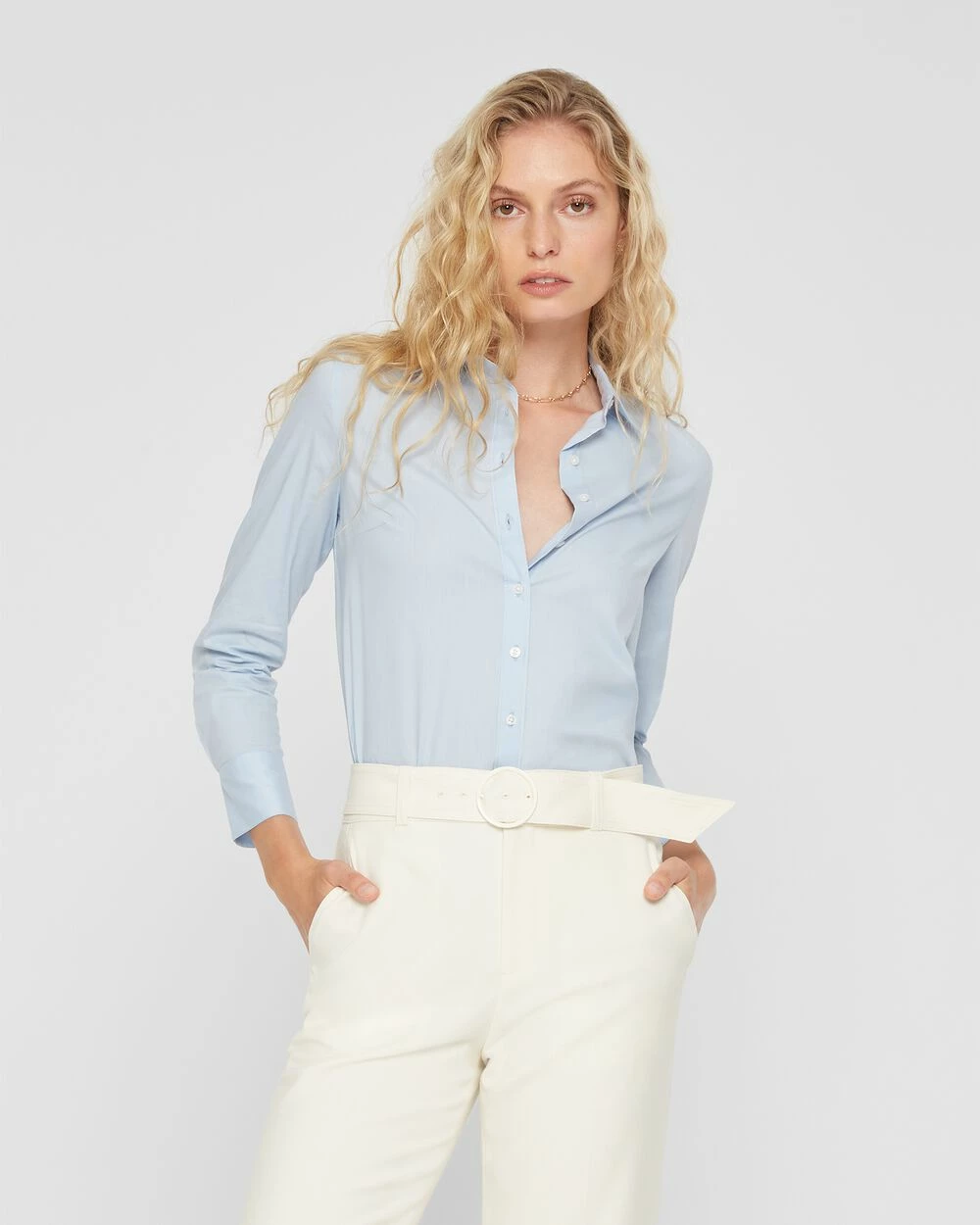 - Spread collar; long sleeves with single-button barrel cuffs; back shoulder yoke; pointelle-stitched trim