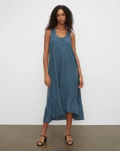 - Scoop neck; sleeveless; panel bodice; tiered high-low hem; jersey trim at neckline and arm openings