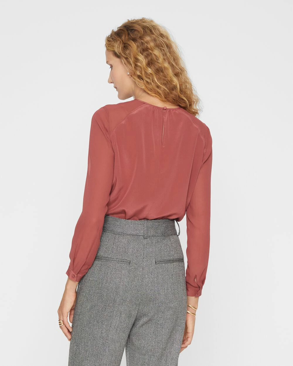 - Round neck with ruched detail; semi-sheer long raglan sleeves; single-button barrel cuffs