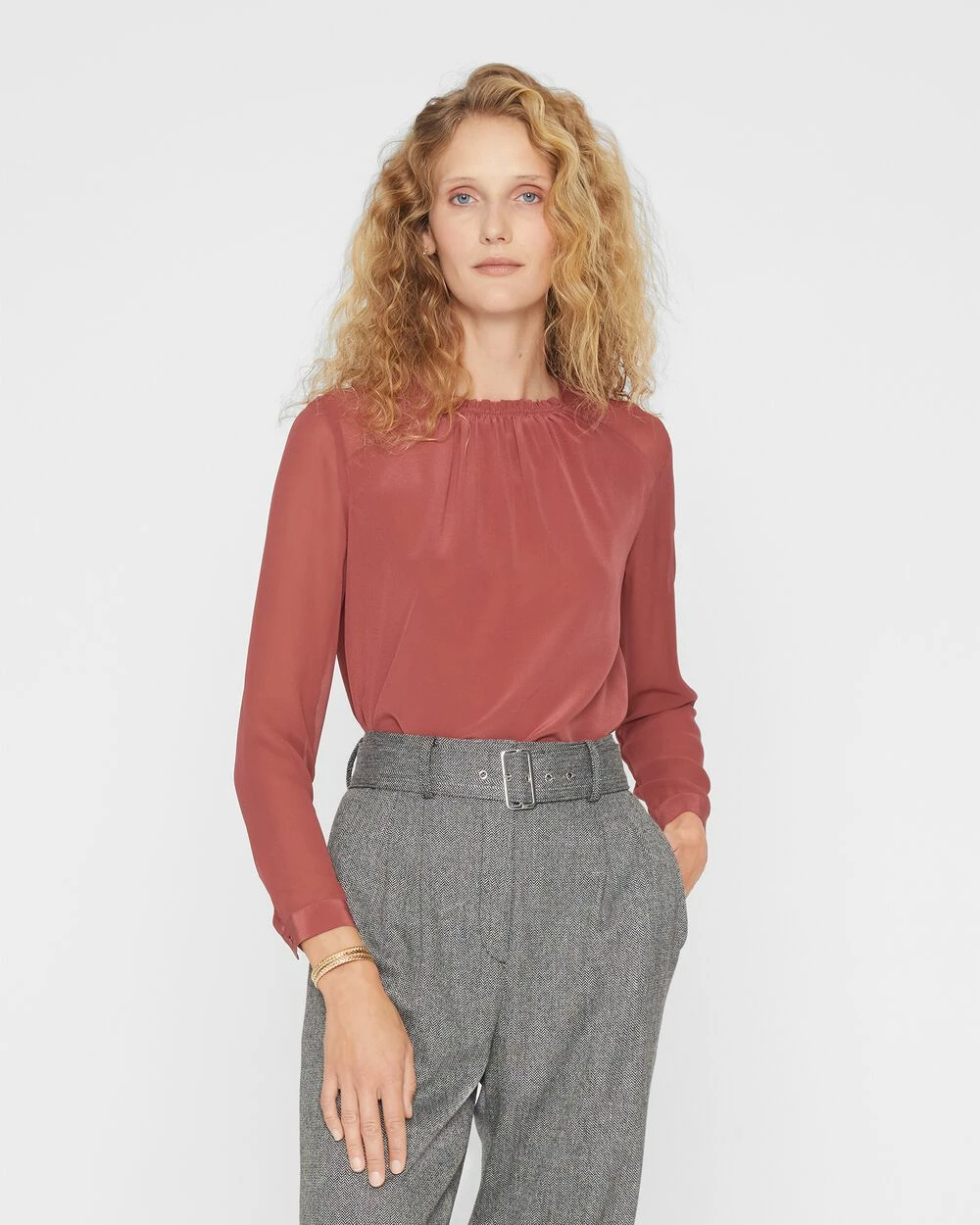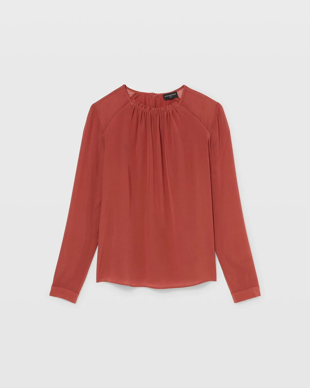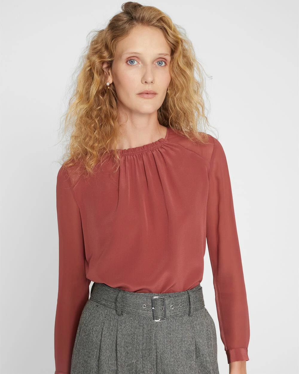 Cut from a lightweight mulberry silk that easily tucks into your favorite trousers, this top is marked by its ruched neckline and semi-sheer sleevesβthe perfect pick for understated elegance.