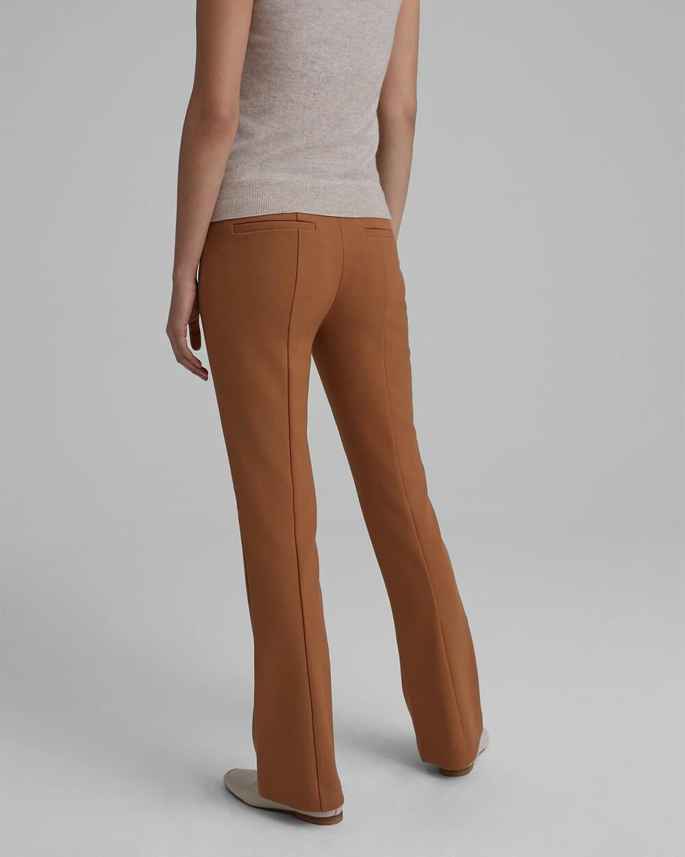 - Concealed side zip with hook-and-eye closure; center seam at front and back of each leg; two back pockets