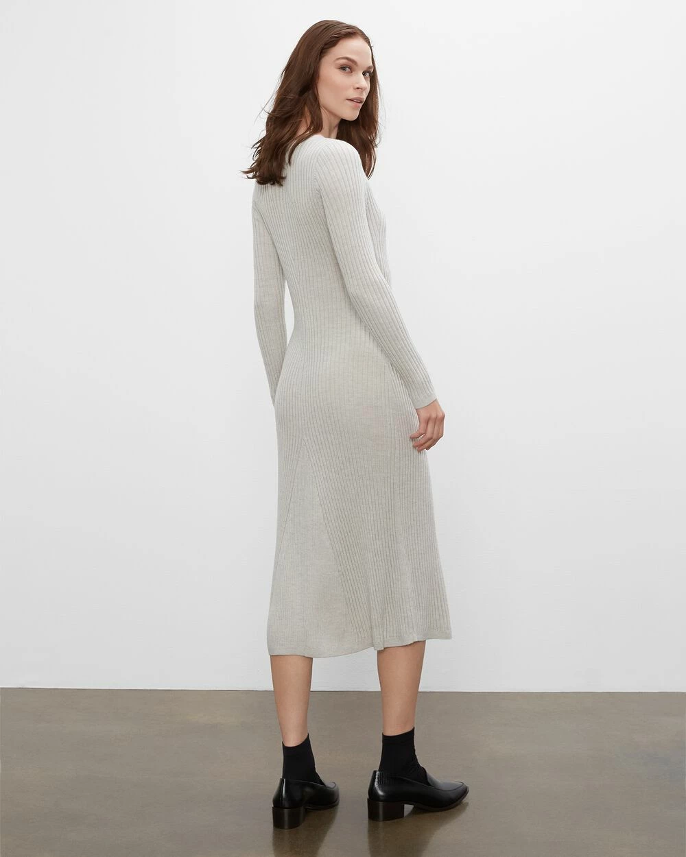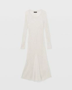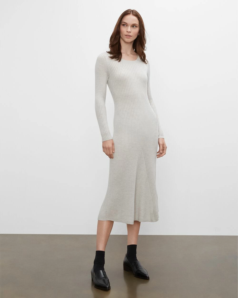 Sleek, sophisticated. As flattering as it is comfy, this long-sleeve sweater dress is sure to become a wardrobe favorite with its slim, elongated silhouette that flares at the hem. Made from 100% ribbed wool.