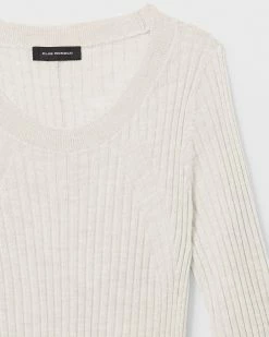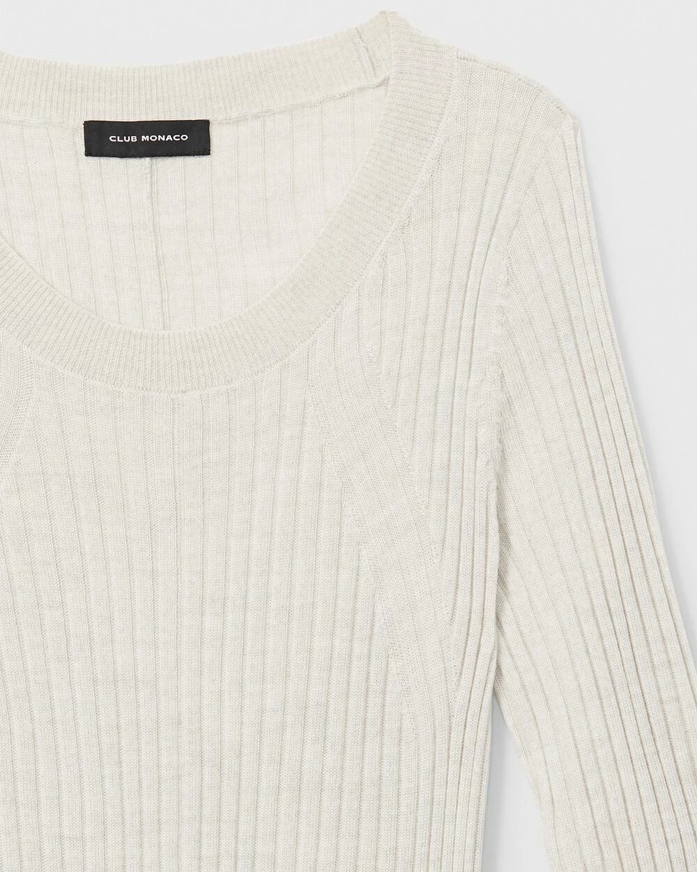- Rib-knit round neck, cuffs, and hem; inverted V inset at hem