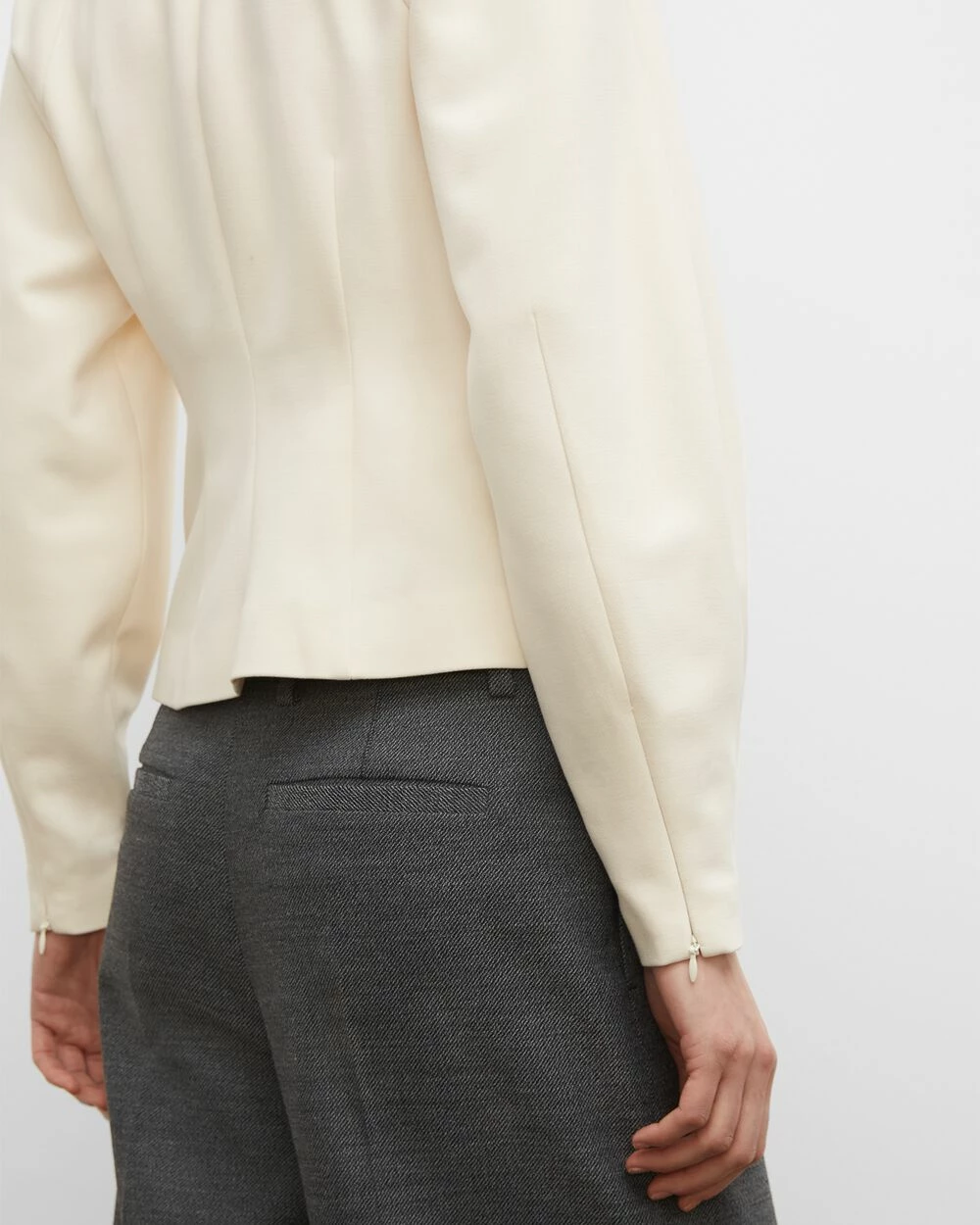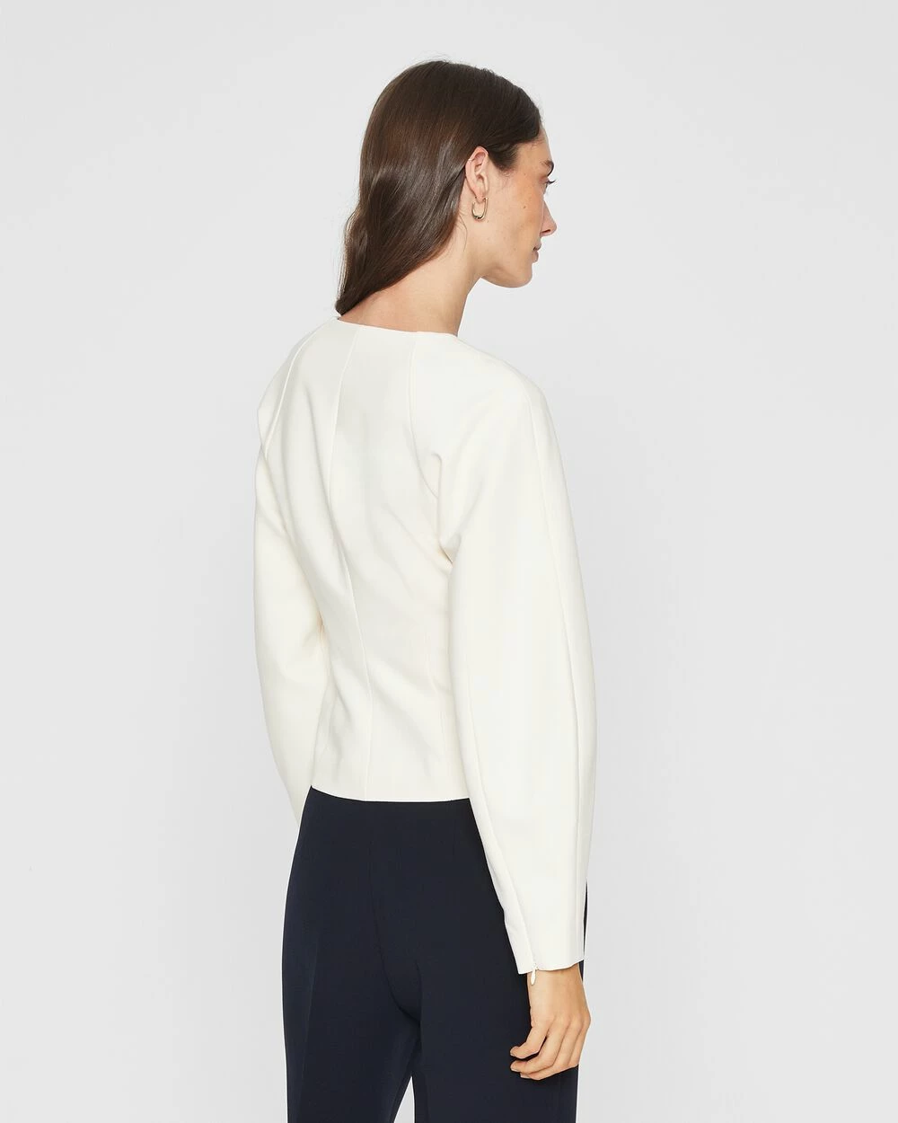 - Panel construction, modified square neck, long sculptural sleeves, zip cuffs