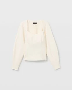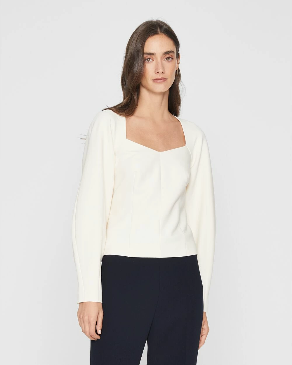 Work-life balance. A squared neckline and artfully sculpted sleeves lend an almost romantic feel to this office-friendly top. With neutral hues and a hint of stretch, it transitions from conference call to date night with elegance and ease. Made with recycled polyester. By turning industrial waste and post-consumer waste into new product, we are repurposing plastic and reducing our dependence on virgin petroleum-based materials.