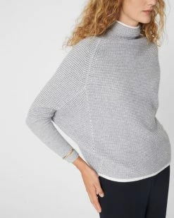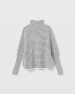 - Mockneck with rolled edge; long dolman sleeves; elongated cuffs with rib-knit trim
