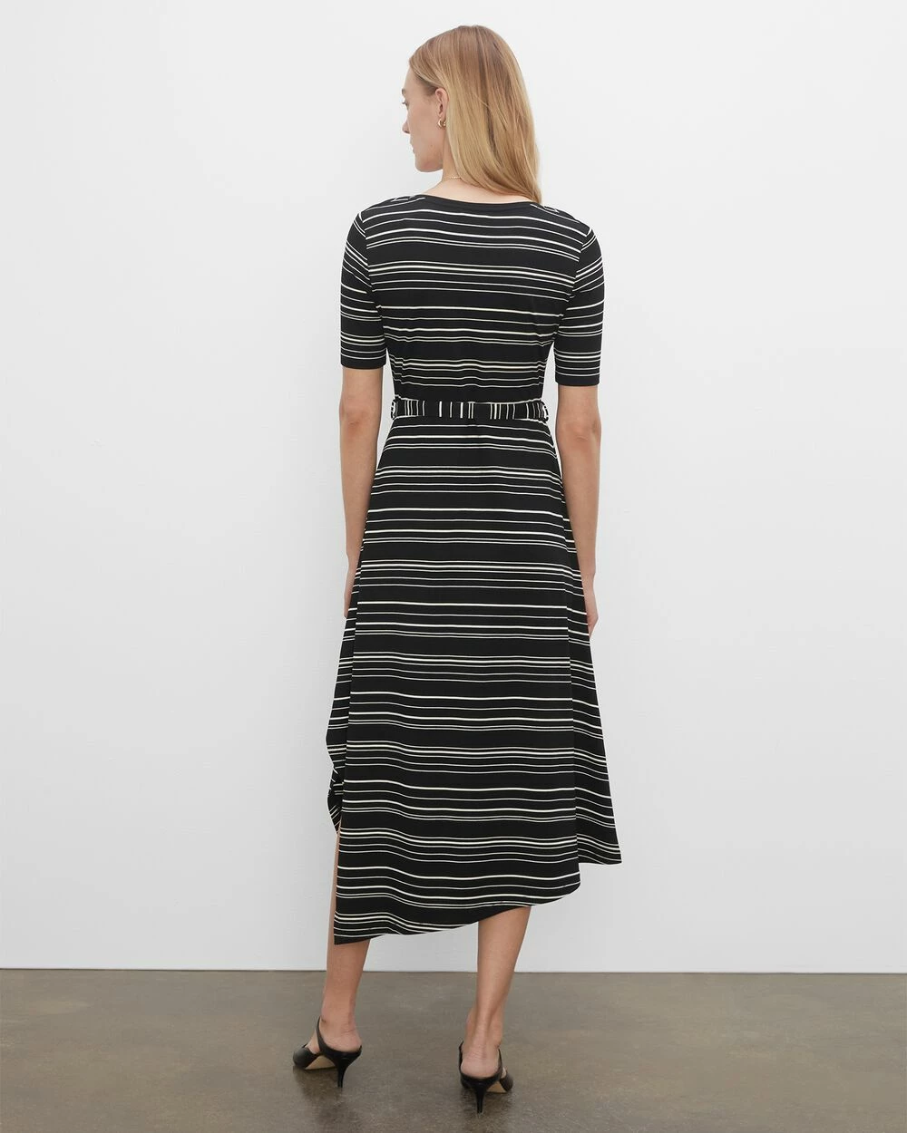 - Square neck; elbow-length sleeves; self-belt at natural waist; asymmetric hem