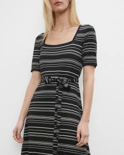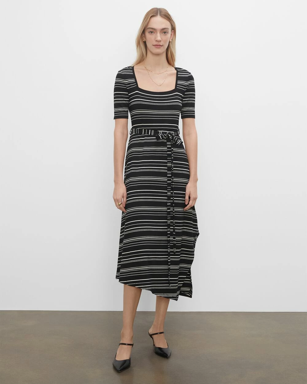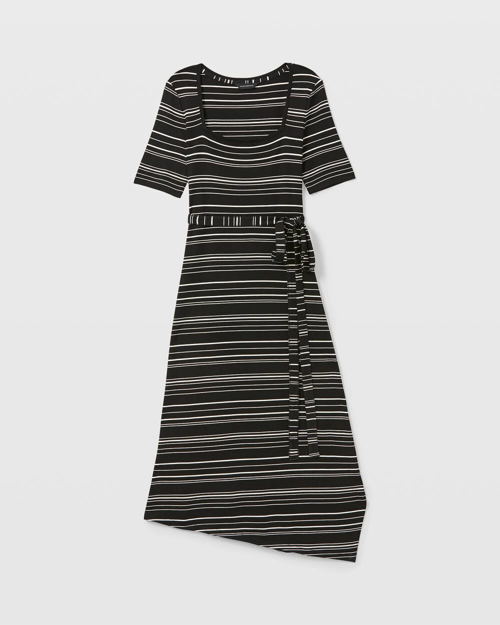 Latest and greatest. With an asymmetric hem for interest and a self-belt to cinch the waist, this square-neck knit dress is sure to be your go to for the next few seasons. Our new silhouette looks great under a leather jacket for chilly nights ahead.