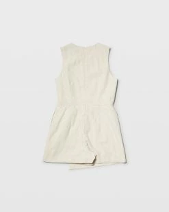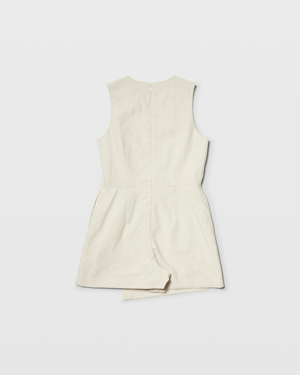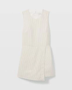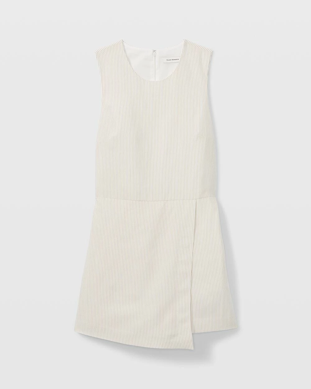 - Round neck; sleeveless; natural waistline seam; two side pockets; faux wrap skirt at front