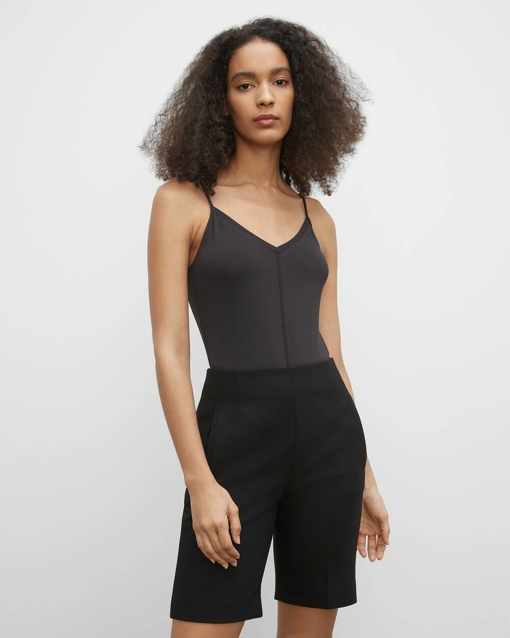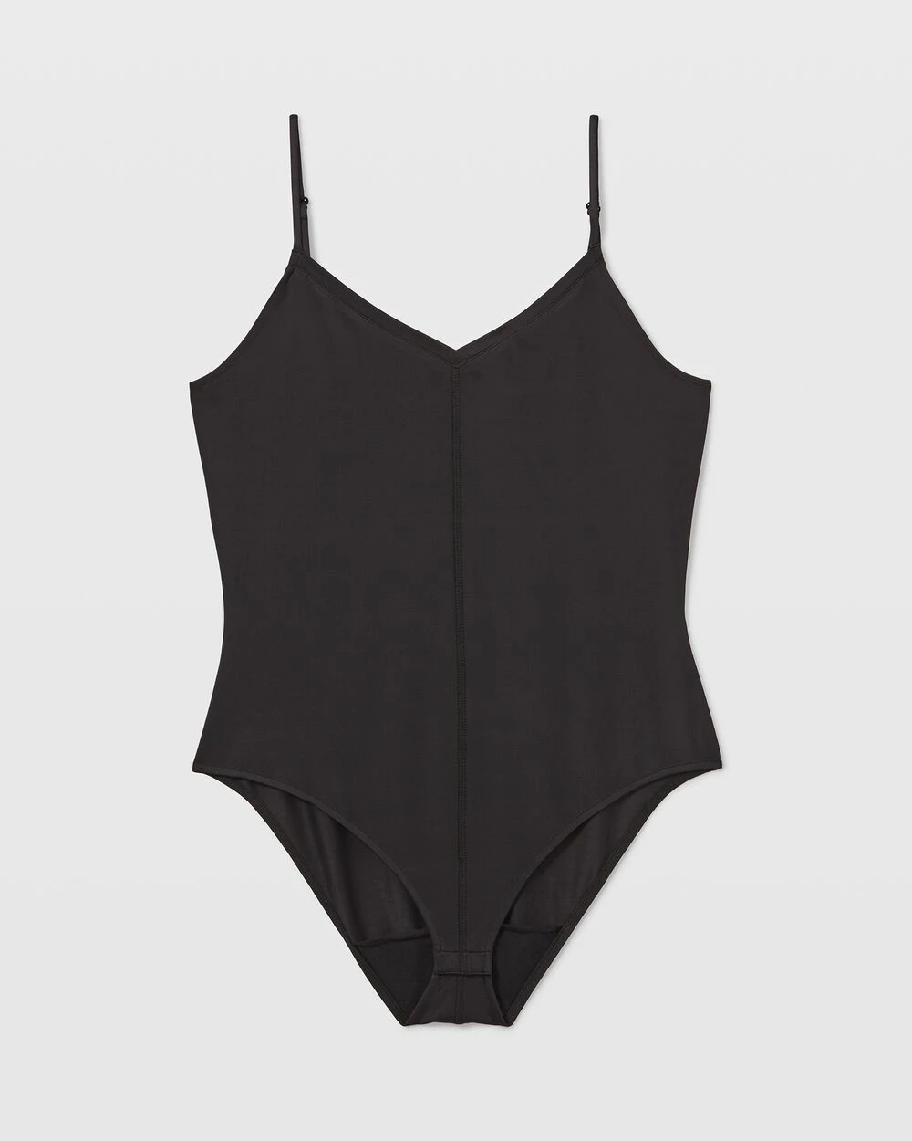 - V-neck; adjustable spaghetti straps; sleeveless; center seam; moderate coverage