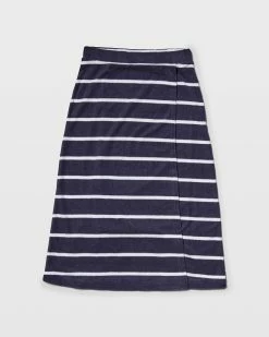 By the sea. A midi skirt gets a nautical feel with striped terry cloth toweling fabric. Wear it with a swimsuit or your favorite camisole.