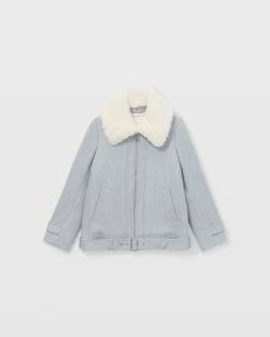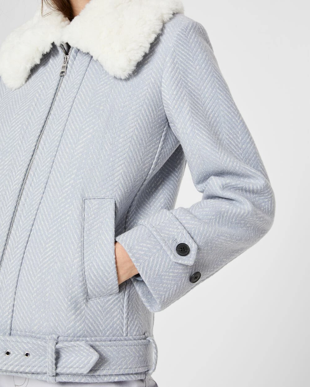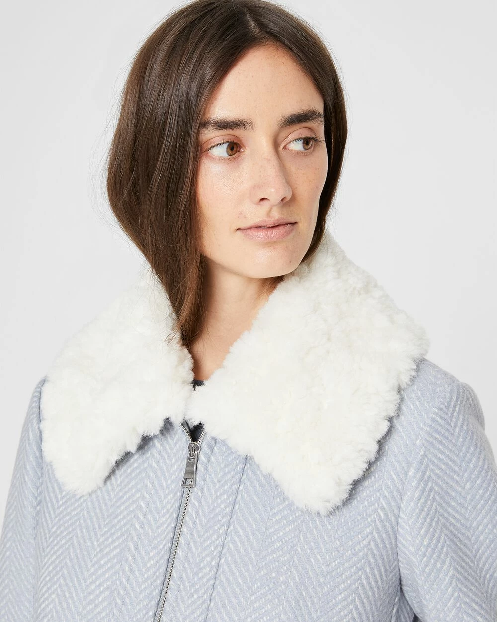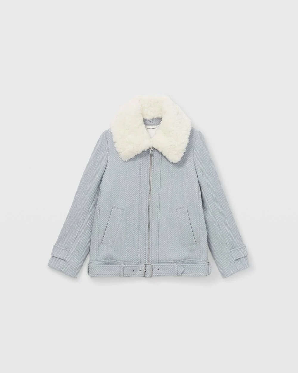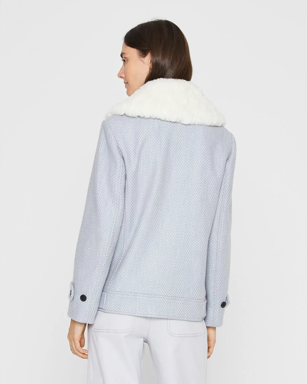 A novel necessity. The classic moto jacket is reimagined for the winter months in a woven wool blend with a removable faux-fur collar for added warmth and style. Trimmed with recycled polyester. By turning industrial waste and post-consumer waste into new product, we are repurposing plastic and reducing our dependence on virgin petroleum-based materials.
