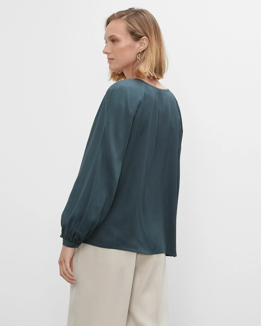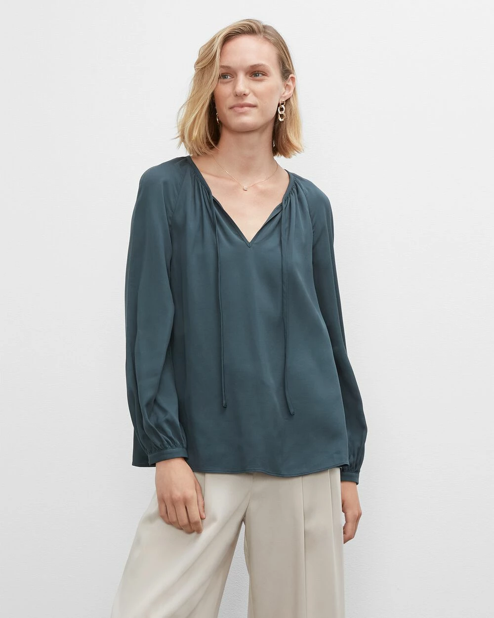 Soft serve. Offered in beautiful neutrals, this fluid, relaxed swing top will quickly become a wardrobe favorite with its billowy blouson sleeves, relaxed silhouette, and pretty tie neck. Wear it over practically anythingβit always looks good.
