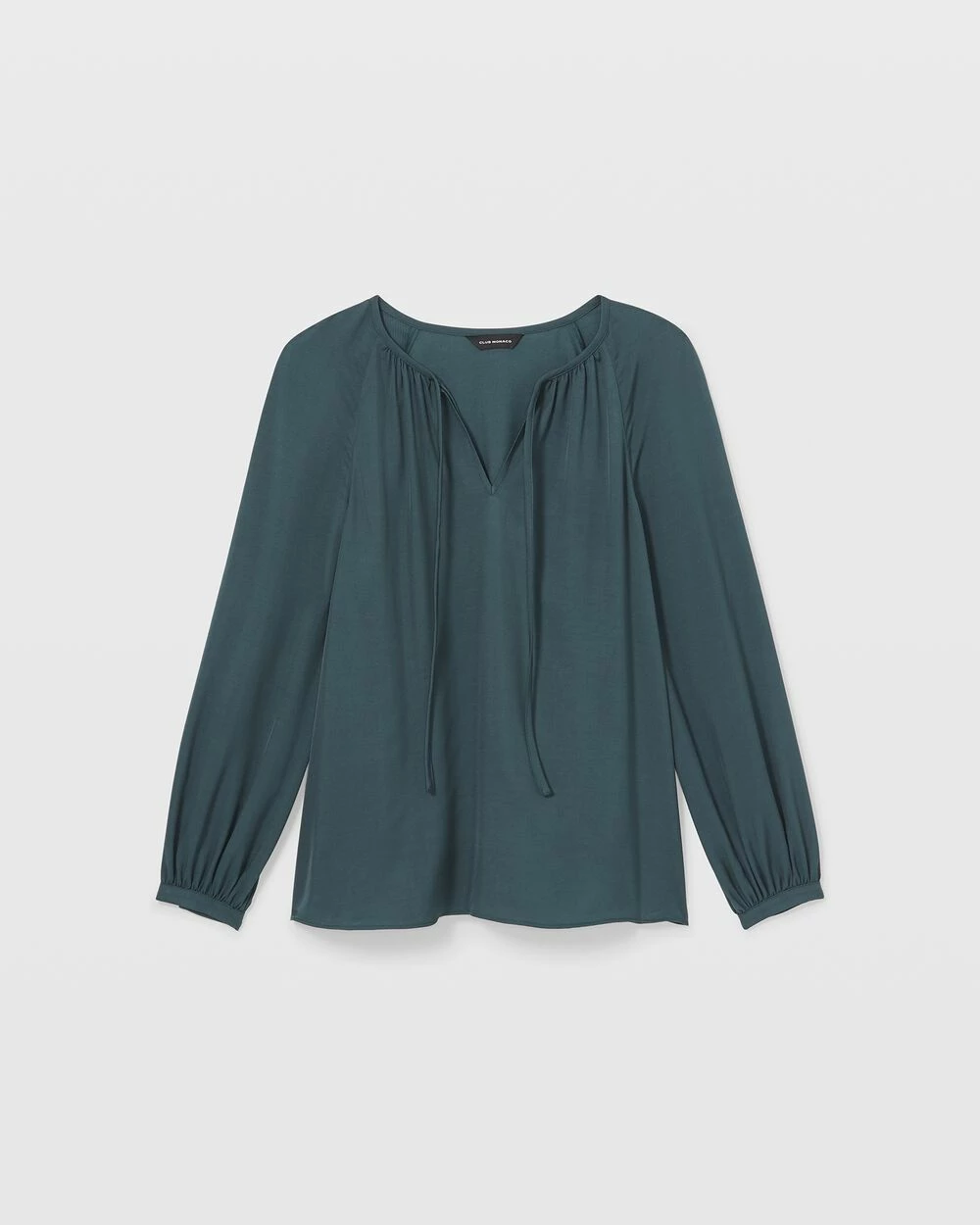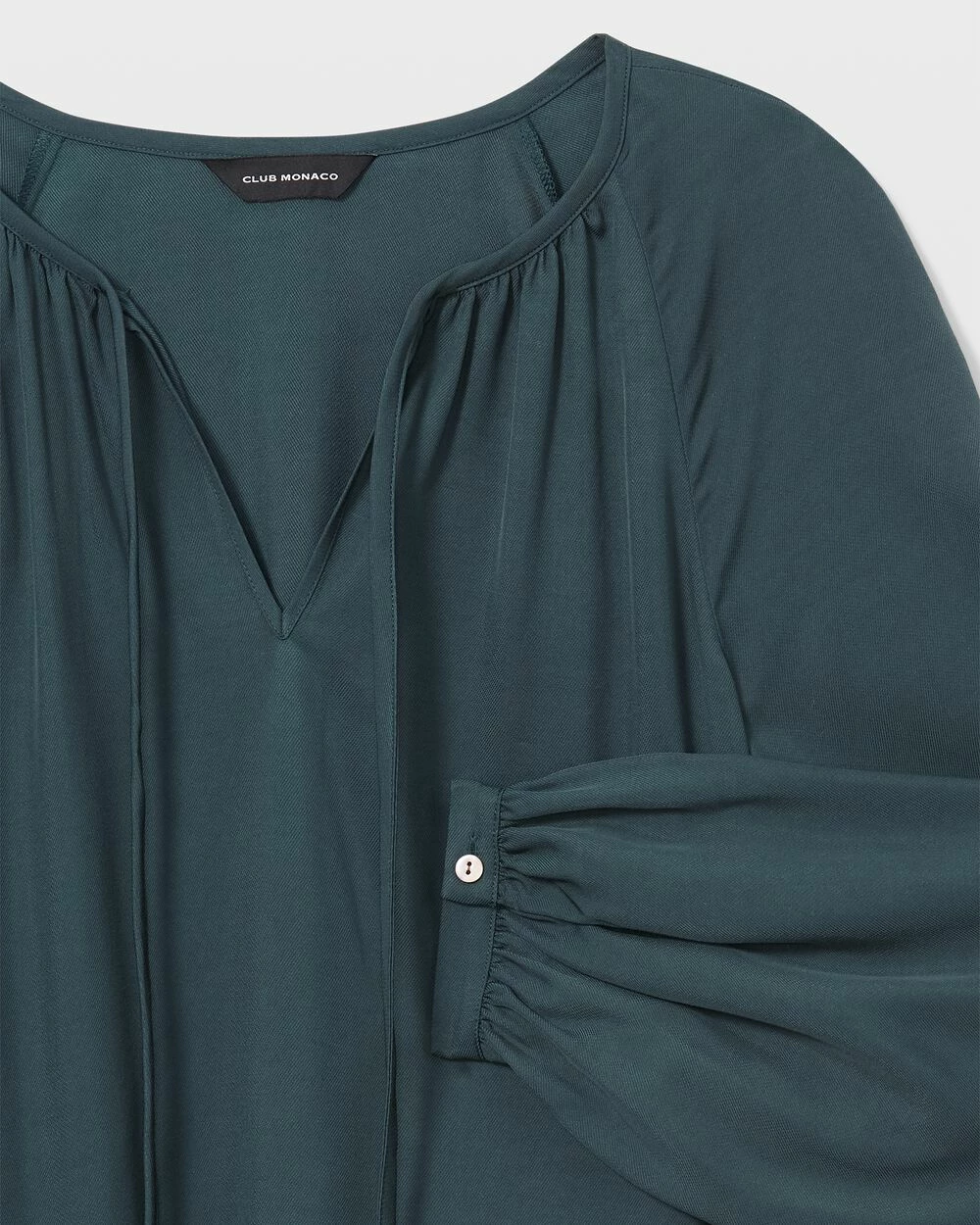 - Self-ties at split neck; long raglan blouson sleeves; single-button narrow barrel cuffs; straight hem