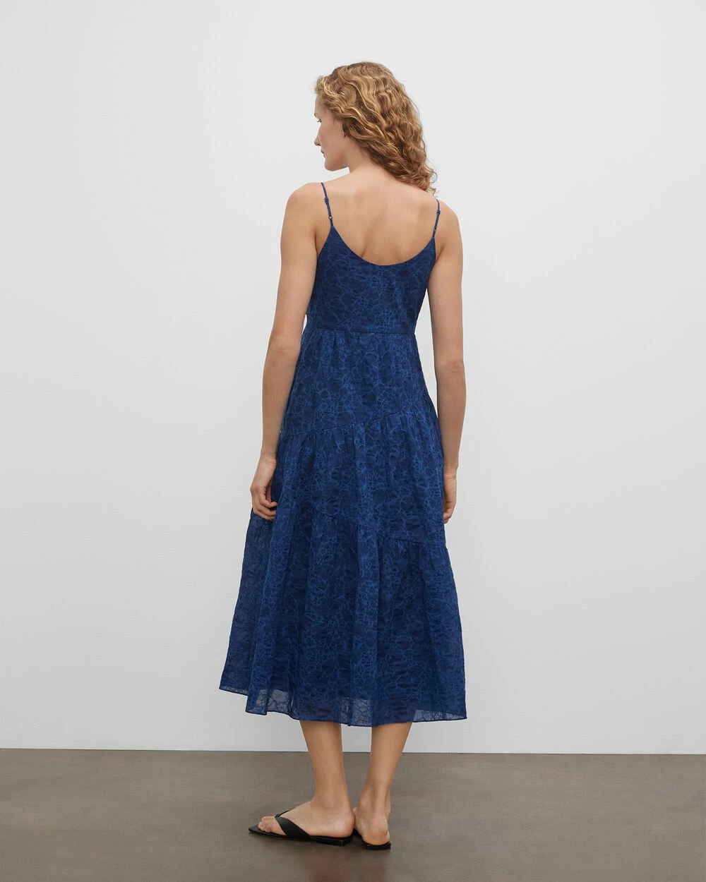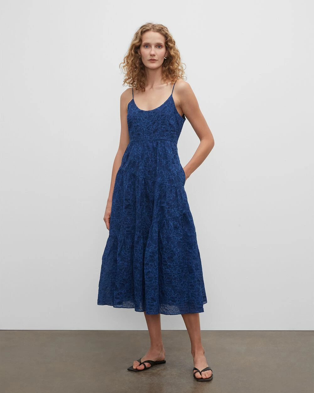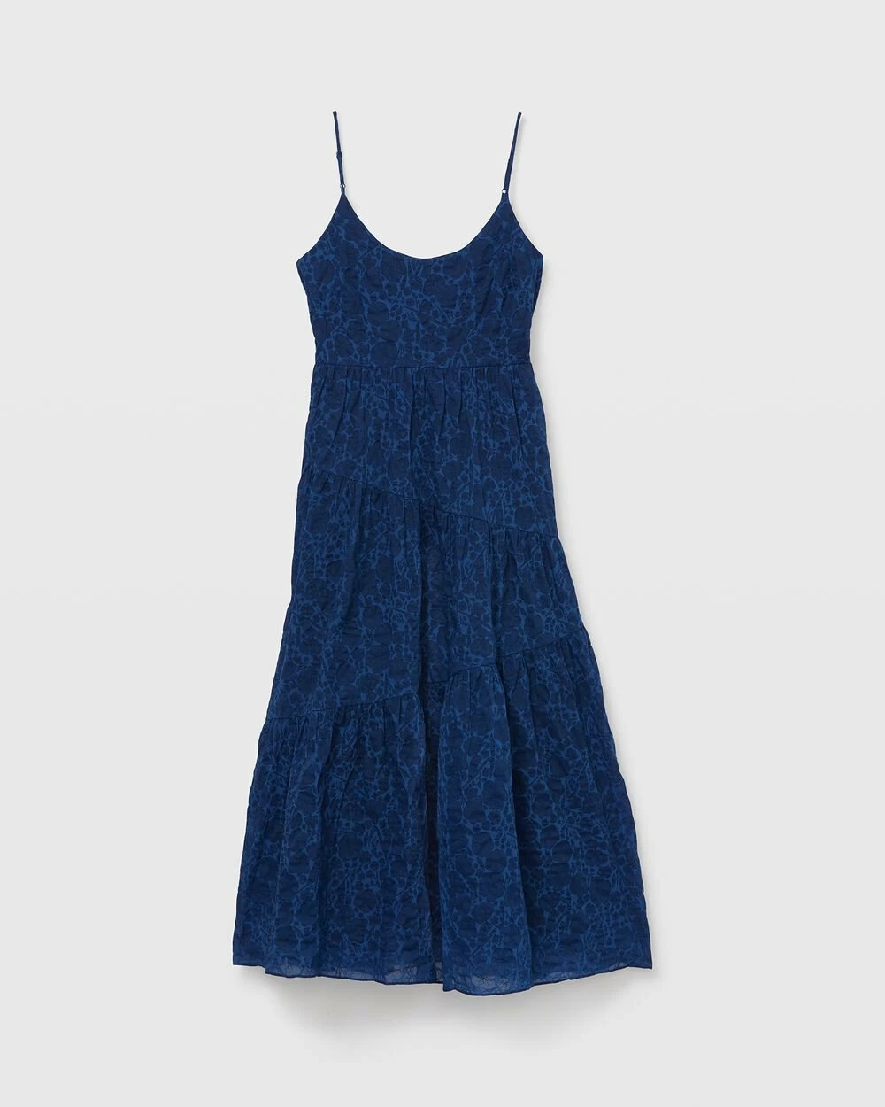 - Scoop neck; adjustable spaghetti straps; sleeveless; button-and-loop detail at side; natural waistline seam; tiered skirt